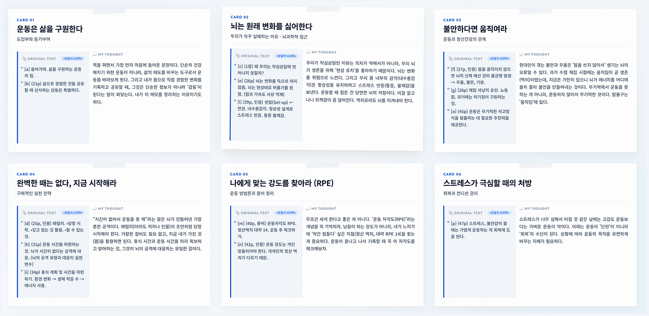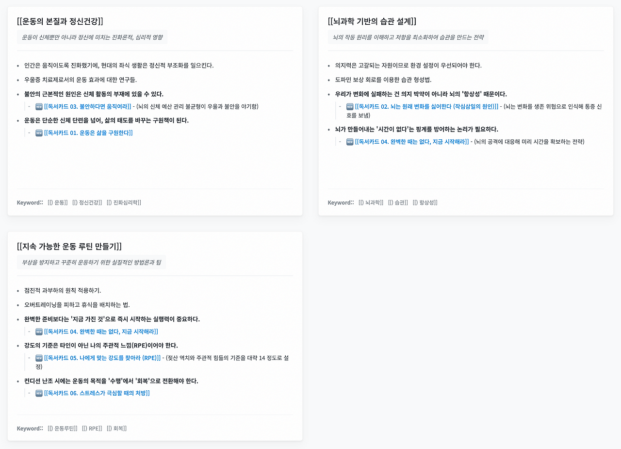 예를 들어서 독서카드 01, 02, 03은 '운동을 해야 하는 이유'라는 영구메모로 가야 하고,