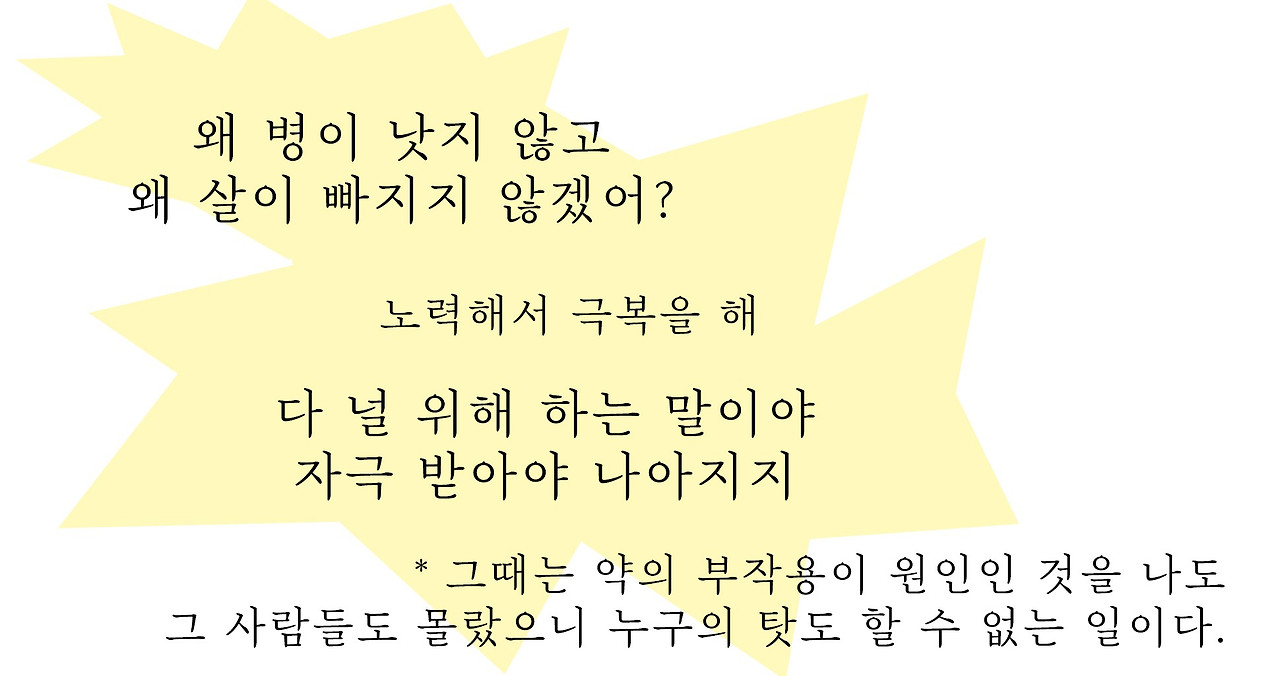 점점 늘어가는 약의 갯수, 정기적으로 맞는 주사는 일상이 되었고, 2년 후에는 약의 부작용까지 더해져 체중은 원래 체중에서 50kg 가까이 늘었다.