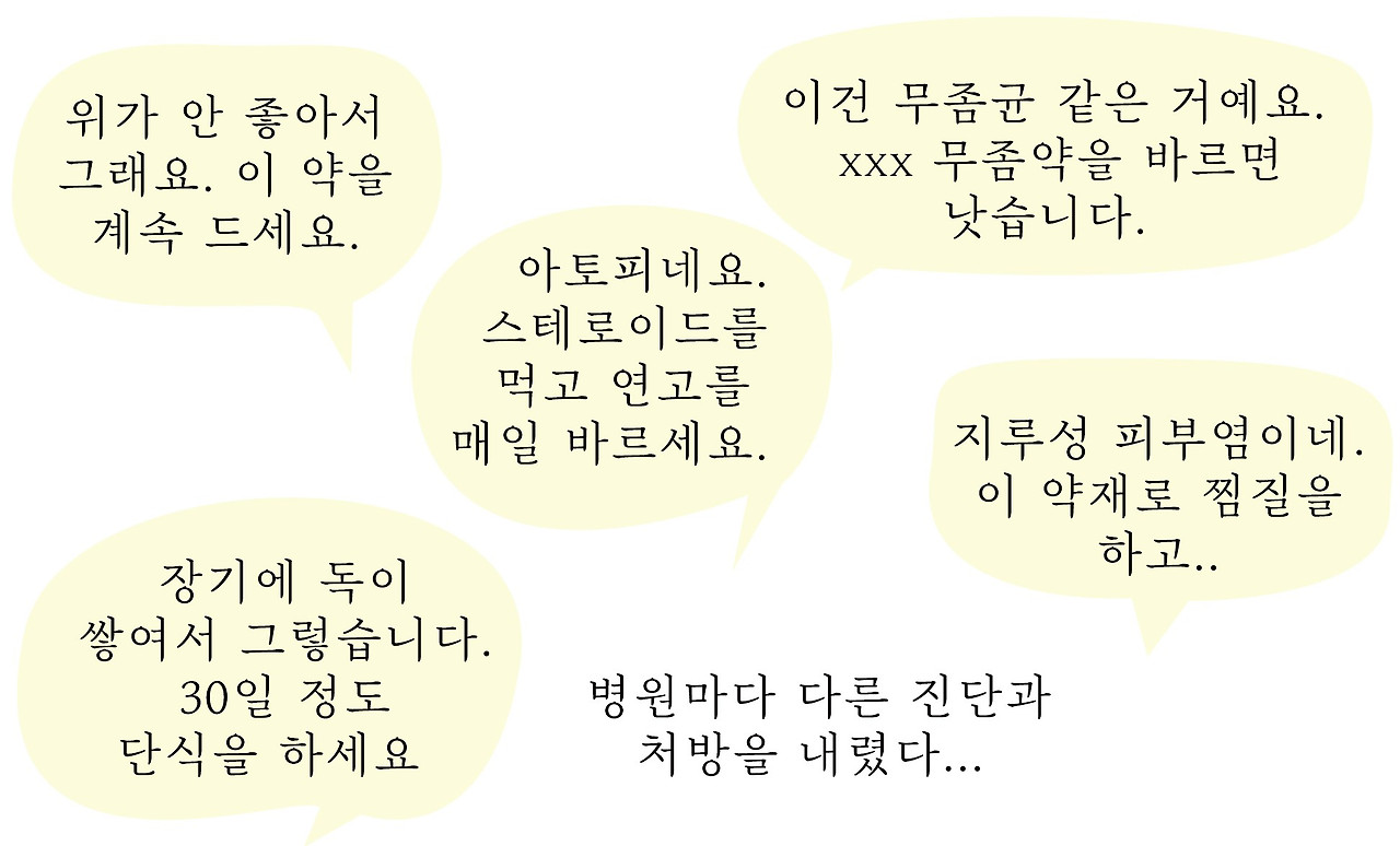 마치 실험을 하듯 여러 치료를 받았지만 결국 근본적인 치료는 자극을 가하는 것을 참는것 밖에 없었고, 그 과정에 염증과 고통을 줄이기 위해 다량의 스테로이드와 항생제를 먹게 되었다.