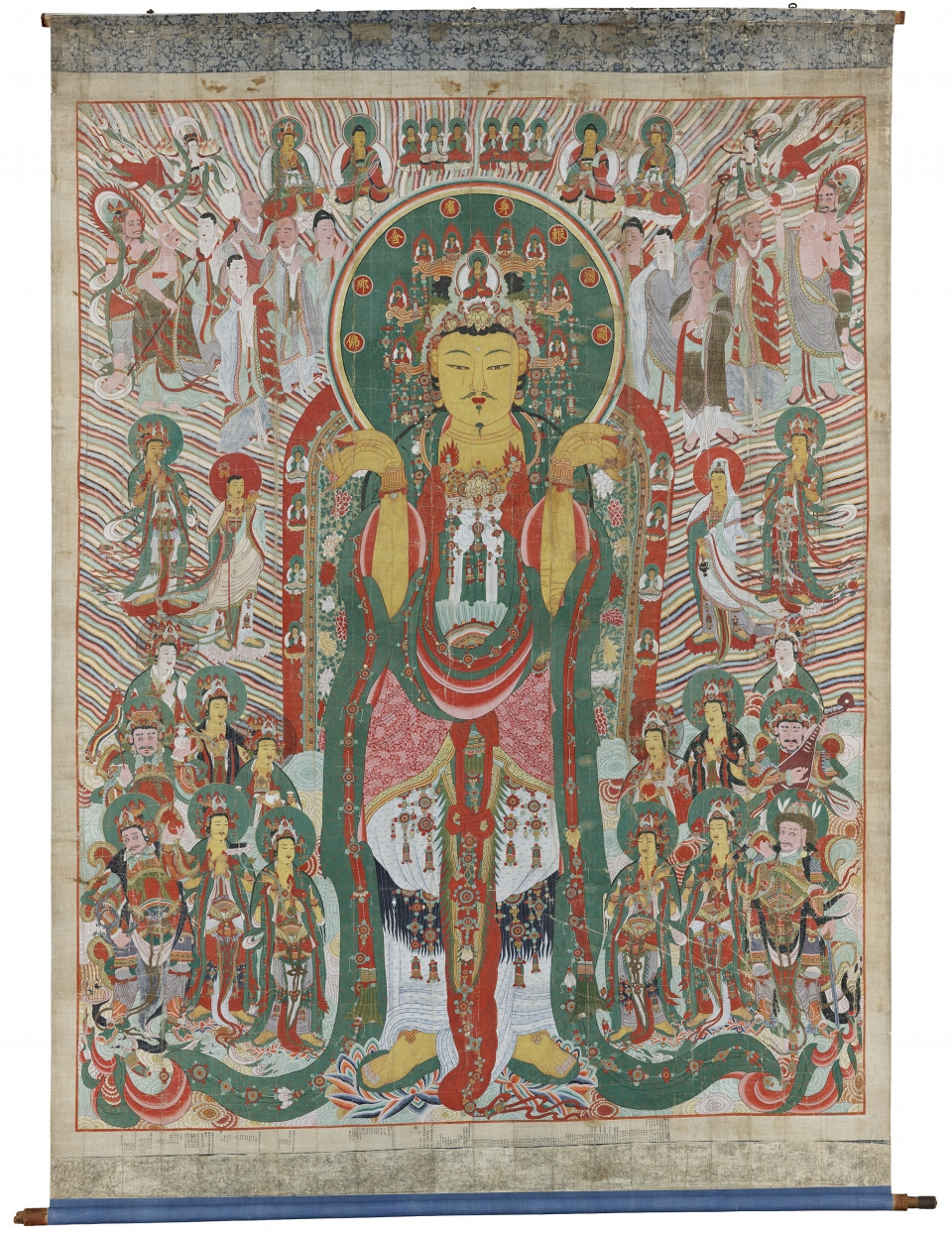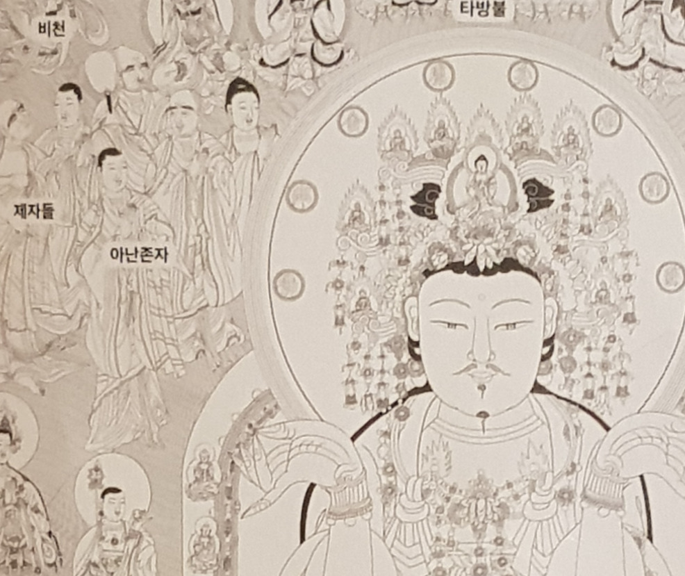 커다란 부처그림, 정확히는 ‘노사나불’, 바로 옆에 놀랍지만 당연하게도 ‘아난’이 서 있었습니다. 상상 속의 ‘아난’은 날카롭고 딱딱하고 타협 없는 스타일이었습니다. ‘기자’ 출신인 ‘김훈’ 작가님의 삭발버전 정도랄까요? 하지만 눈앞의 ‘아난’은 달랐습니다. 뽀얀 피부에 발그레한 볼, 뭘 듣고 있는지 입은 ‘헤~’ 벌어져 있습니다. 저 표정을 나도 닮고 싶다는 생각이 일었습니다. 지금 생각하니 그 표정이 이 글을 쓰게 만든 ‘수줍은 첫발’이지 않을까 싶었습니다. 신기하게도, ‘아난’이 눈에 들어왔을 때부터 괘불에 대한 모든 것이 달리 보이기 시작했습니다. ‘아난’의 옆에 있는 저 사람은 누구일까? 오른쪽에 '선녀'같은 사람은 누구지? 아래쪽에 있는 ‘괴물’같이 생긴 이들은 뭐하고 있는 거지? 부처님 머리 주변에 둘러싸고 있는 ‘미니미 부처님’들은 또... 궁금증은 꼬리에 꼬리를 물었습니다. ‘투머치’한 ‘단체사진’ 같은 그림이 어느새 수백, 수천 가지 이야기를 품고 있는 거대한 스토리로 보였습니다. 저거 다 뜯어보려면 평생도 모자라겠다는 생각이 들었습니다. 그러다 보니, 괘불 주위에 있는 불상들까지도 궁금해졌습니다.