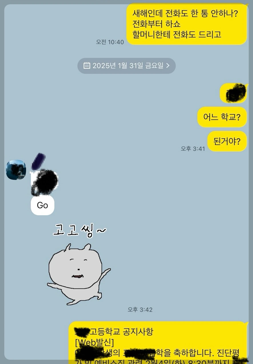 생존만이라도 알리라 했건만.... 꼰대 같은 기준인지는 모르겠지만 명절에 연락도 안 하는 아들의 행동이 서운했다. 시간이 갈수록 서운함은 분노로 바뀌어갔다. 명절 기간이 지나고도 연락이 없는 것을 보며 나는 가만히 있지 않기로 했다. 가족 가톡방에 글을 남겼다. 한 마디로 "너 그렇게 사는 거 아니야. 기본도 안된 놈이 뭘 한다고 하는 게 웃기는군." 이런 말은 아니지만 맥락은 같다. 답장이 없었다. 며칠이 지나 나는 작은 아들의 고등학교 배정 소식을 알리는 글을 가족 카톡방에 올렸다.