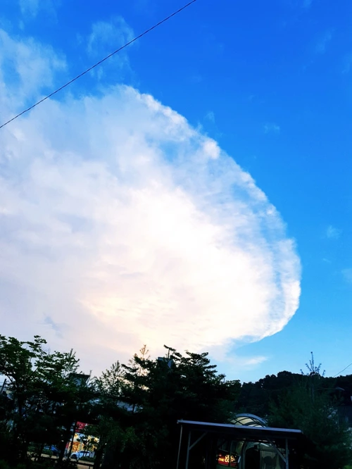 그녀는 집에서 가족들과 저녁을 먹으며 뉴스를 봤다. 뉴스에서도 이 이상한 구름에 대한 이야기로 가득 차 있었다. 한국 어디쯤에서 시작된 파도 구름은 몇 시간이 지난 지금 다른 나라까지 퍼지고 있었다. 그녀는 저녁을 다 먹은 후 창문을 열고 하늘을 올려다봤다. 집 뒤에 산이 있지만 그녀의 집은 10층이라 산 너머 하늘을 볼 수 있었다. 지금은 밤이라 이상한 구름이 보이지 않았다. 평범한 구름들 뒤에 가려졌던 달이 조금 모습을 보였다. 그 달빛은 살짝 푸르게 보였다. 그러나 그 달도 곧 구름 속으로 자취를 감춰 어두운 밤이 되었다. 바람이 살짝 불었다. 평소보다 조금 서늘한 느낌에 그녀는 몸을 떨고 창문을 닫았다.