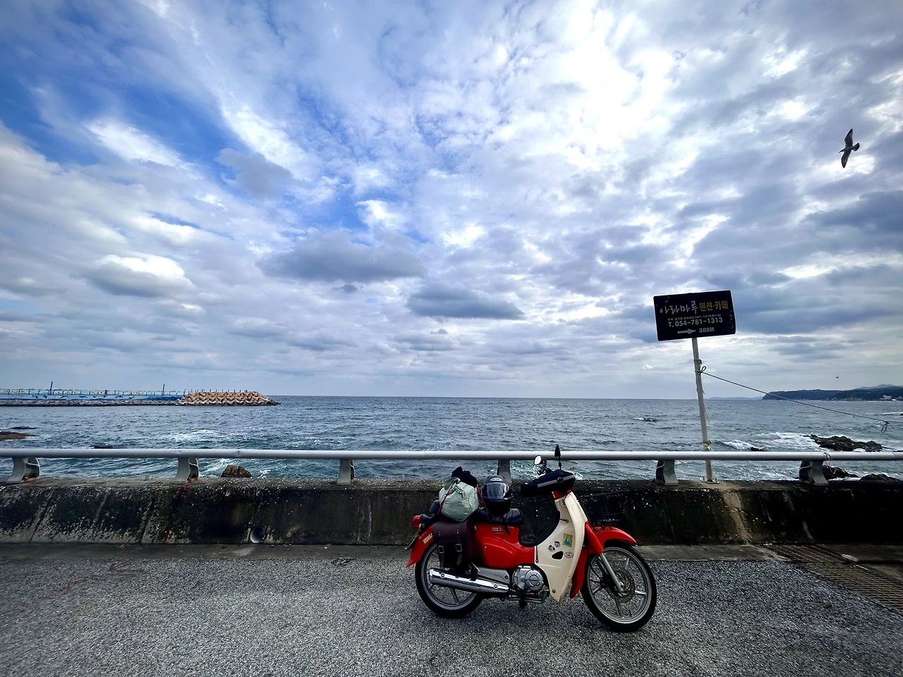 오토바이와 나 단 둘이 여행을 다녀왔다. 대관령을 넘어 강원도 강릉과 동해를 지나 삼척에 당도한 뒤 조금 더 남쪽으로 내려가 경상북도 울진을 둘러봤다. 장거리 주행에 익숙하지 않았던 나는 첫 날 400 km 주행을 끝내고 온 몸이 쑤셨다. 겨울이라 해가 일찍 떨어질 것이 염려되어 쫓기듯 했던 것도 한 몫 했을 것이다. 시속 90 km 이상으로 주행하는 긴 도로의 끝에 오토바이에서 내리면 손바닥과 손가락 마디에서 오토바이의 진동이 느껴졌다. 그 느낌이 불쾌했다. 기름이 잔뜩 뭍은 오토바이의 끈끈한 지문이 남은 것만 같아서였다. 출발할 때에만 해도 오토바이는 나에게 차가운 쇳덩어리와 다름 없었다. 이 녀석과 함께한 지 이제 4년이 되어가는데도, 그동안 좋아하는 사람들과 함께 라이딩을 하며 추억을 쌓았어도 그랬다. 심지어 이 여행을 계획하고 바로 며칠 전까지 나는 아팠다. 그래서 출발 날짜를 예정보다 하루 더 미루기도 했다. 영 정감이 가지 않는 이 주황색 녀석과 함께 단 둘이 그 멀리까지 여행을 다녀와야 한다는 사실이 퍽 부담스러웠나보다.