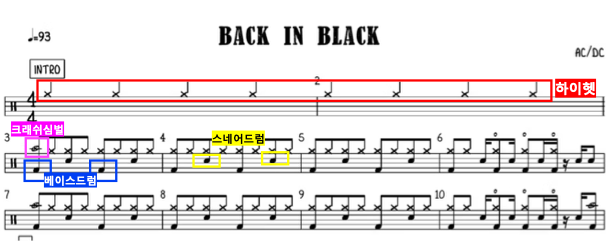 그 다음으로는 구성 악기들의 조합의 '텍스트 (의미)‘가 무엇인지 이해해야 한다. 예를들어 AC/DC 라는 밴드의 <Back in black> 이라는 곡을 예를 들어 설명해보자. 이 곡은 기본적인 8비트락 패턴의 곡이다. 이 때 하이헷은 8분음표로 연주하여 한 마디에 8번의 소리를 내며 박자를 세어 주는 역할을 하고, 베이스 드럼의 소리는 8분음표 4개마다 첫 번째에 등장하여 무게감을 준다. 스네어 드럼의 소리는 8분음표 4개 중 세번째에 등장하여 8비트락 특유의 시원시원한 느낌을 더해준다. 크래쉬 심벌의 소리는 특정 섹션의 처음 혹은 필인 (Fill in, 구간이 바뀔 때 극적인 느낌을 주기 위한 즉흥적 성격의 장치) 직후에 등장하여 시작을 알리는 역할을 한다.