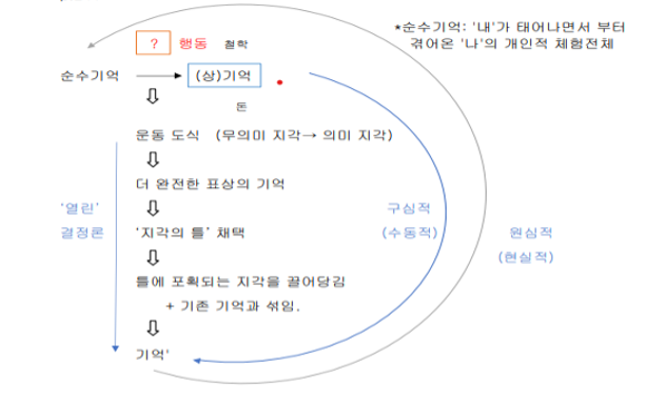 순수기억 (1) → 상기억 → 운동적 도식 → 지각의 틀 → 새로운 지각 → 기억 섞임 → 순수기억 (2) ...