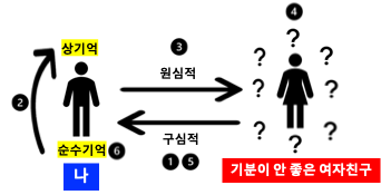 이 순수기억들 자체는 평소 여자친구가 기분이 좋을 때에는 무용하게 순수기억의 상태에 머물러 있다가 특정 상황 (여자친구가 기분이 안 좋은 상황)이 되면 다시 (상)기억화 되어 사용된다. 이 때, 식별은 원심적 (순수기억→ 외부대상) 그리고 구심적 (외부대상 → 순수기억) 방향으로 이루어진다.