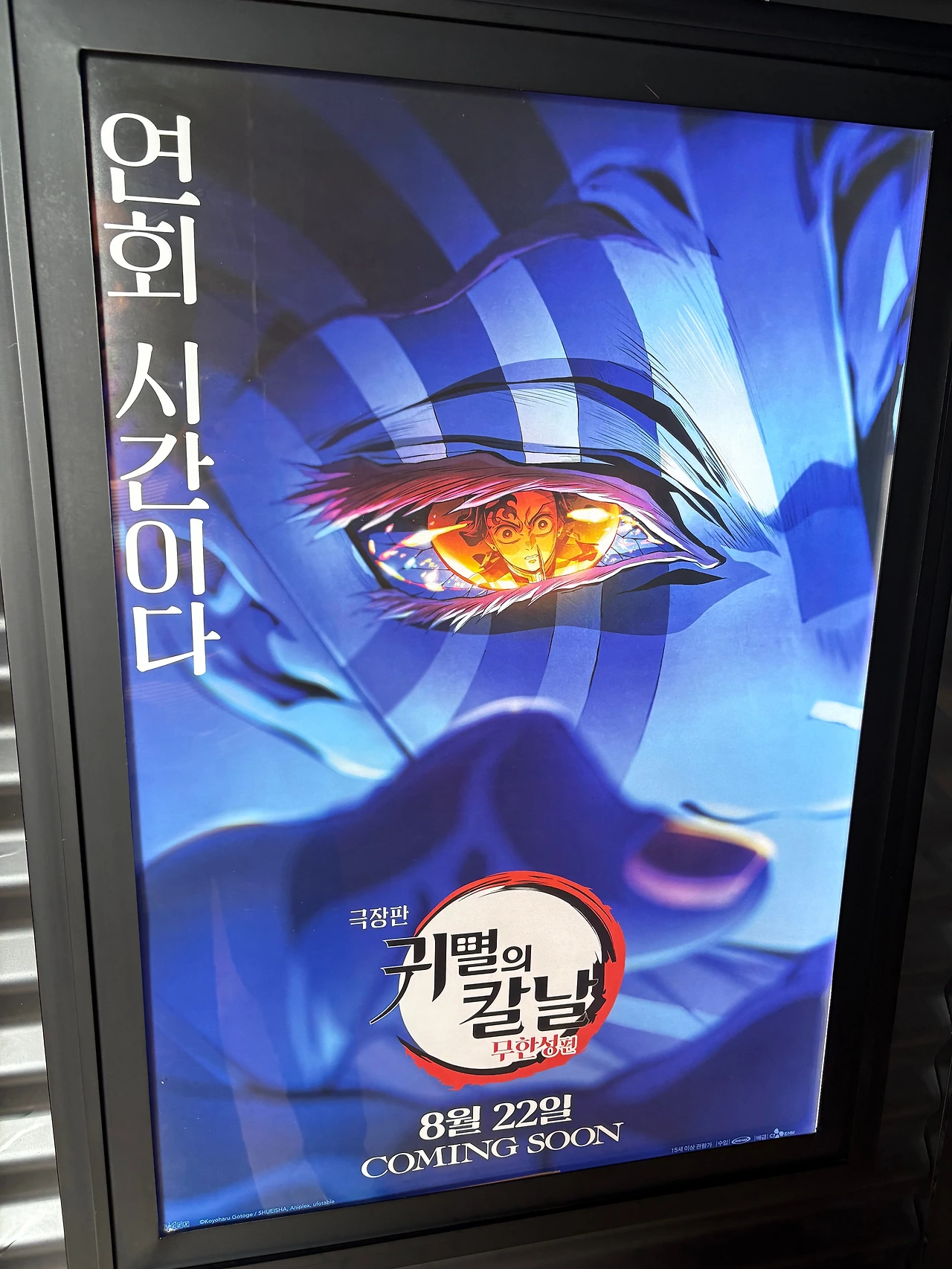 오늘 귀멸의 칼날 [무한성편]편을 보고 왔다. 원래도 귀칼(귀멸의 칼날)을 좋아했었지만 죄다 19금이라서 못봤었는데 이번에는 15금이라서 엄마랑 내 쌍둥이 언니(나이 같음)랑 다같이 보러 갔다. 이상하게도 영화 상영 시간이 2시간 35분이었는데 너무 짧다는 생각이 들었다. (딱 10초만 보고 나온 것 같은 느낌이었다...)