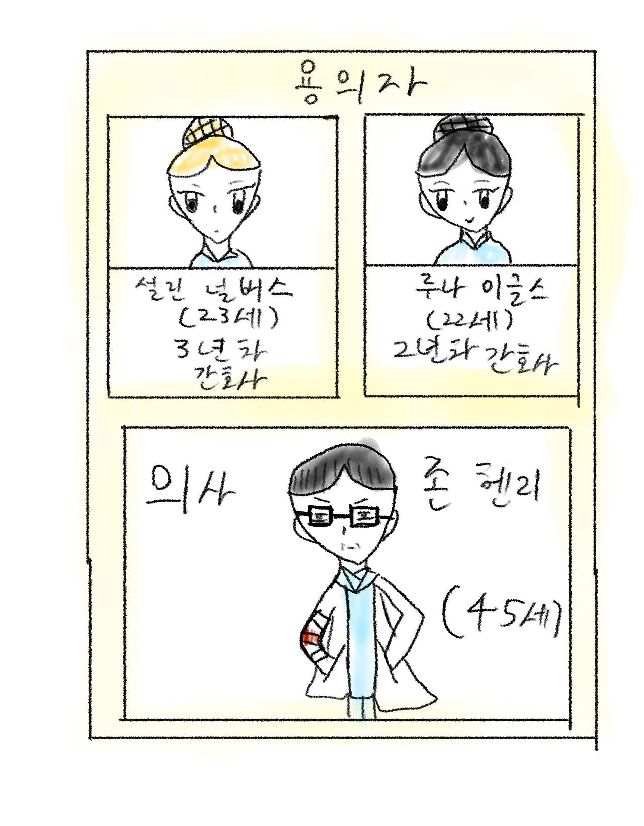 “호, 혹시 메스가 증거물로 발견되었다면 범인이 병원에서 일하는 의사나 간호사일 가능성이 크지 않을까요? “ 마리가 말했다. ”그럴 수도 있어. 하지만 의사나 간호사가 딱히 노르만 씨에게 적개심을 품고 살해했을 리는 없잖아.” “하지만 의료용 메스는 돈이 아주 많은 사람이 아니라면 보통 일반 사람은 살 수 없는데…!” “흠…. 일단 내 추리로는 노르만 씨는 다리 부종 때문에 평소 지팡이를 짚고 다녔을 거야. 그런데 루이스 강변을 건너다가 범인을 마주쳤고, 그 둘은 몸싸움을 했지. 그러다가 범인의 메스에 옆구리에 찔리자, 노르만 씨도 지팡이로 범인의 신체 중 어느 부분을 가격한 거야. 그래서 범인의 피가 묻은 거고. “ 루이나가 시체를 바라보며 말했다. ”하지만 가장 유력하게 범인으로 추정되는 사람은 역시 의사나 간호사로밖에 추정되지 않아. 일단은 병원으로 가봐야겠어. “ ”하, 하지만 어느 병원인지 알 수가 없는데요? “ ”메스를 잘 봐. “ 마리는 메스를 자세히 살펴보았다. 살펴보니 정말 메스의 손잡이 부분에 조그맣게 ‘워터타이트(watertight-완벽한) 병원‘이라고 쓰여 있었다. 그 글자를 확인한 마리는 곧바로 루이나와 함께 워터타이트 병원으로 향했다. 프렝크 형사는 경찰서에서 좀 더 정학한 정보를 확인해 보기 위해, 경찰서에 남기로 했다. 병원은 많은 사람들로 가득했다. 루이나는 접수대에 가서 간호사에게 사건의 전말을 빠르게 설명했다. 그리고… 마리의 예상은 적중했다! 노르만 씨는 어제 병원에 방문한 적이 있다고 말이다. 루이나는 노르만 씨에게 처방전을 준 간호사와 노르만 씨의 진료를 본 의사를 데려와줄 수 있겠냐고 물었다. 간호사는 알겠다고 했고, 잠시 뒤 간호사 2명과 의사 1명이 다가왔다. 3년 차 간호사 설린 널버스와 2년 차 간호사 루나 이글스, 그리고 의사 존 헨리.