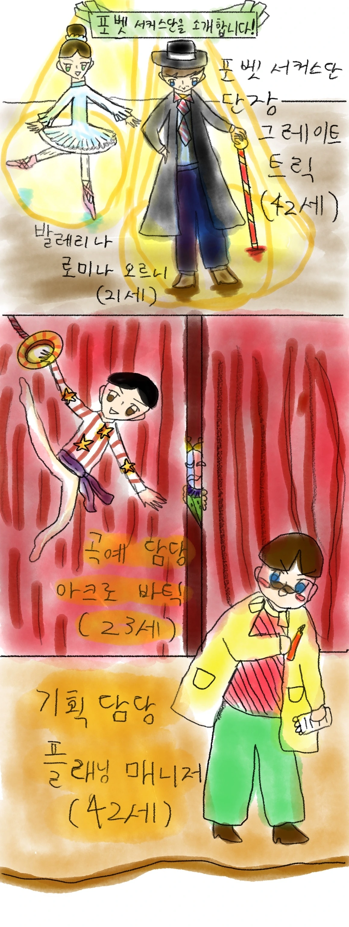 그때였다. “끼아아아악!!!” 갑자기 분장실로 누군가 뛰어들어왔다. 빛나는 초록색 눈에 윤기가 흐르는 짙은 밤색의 머리를 가진 하늘색 발레복을 입은 여자였다. 그 사람은 바로, 요즘 이 분장실에서 피에로를 많이 본다는 포벳 서커스단의 발레리나 로미나 오르니였다. 로미나는 단장인 그레이트를 보자 흠칫했다. “앗, 다, 단장님, 아, 안녕하세요?”