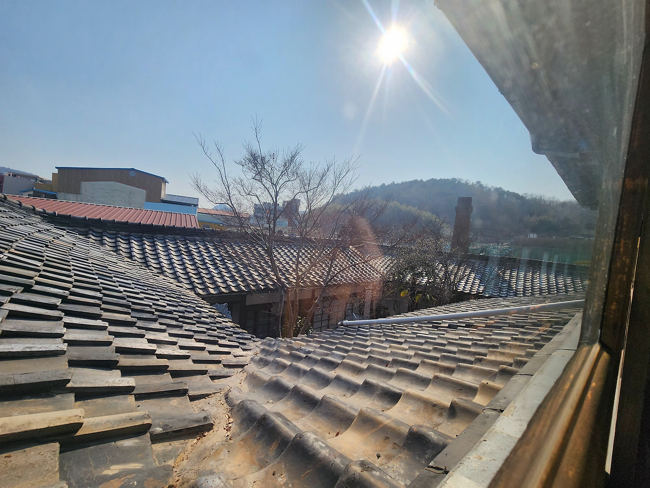 2층으로 뻗은 계단을 오르며 오른쪽으로 난 창밖 풍경에 잠시 서 있었다. 지붕과 사이로 보이는 정원, 하늘과 햇빛 모든 것이 충만했다.