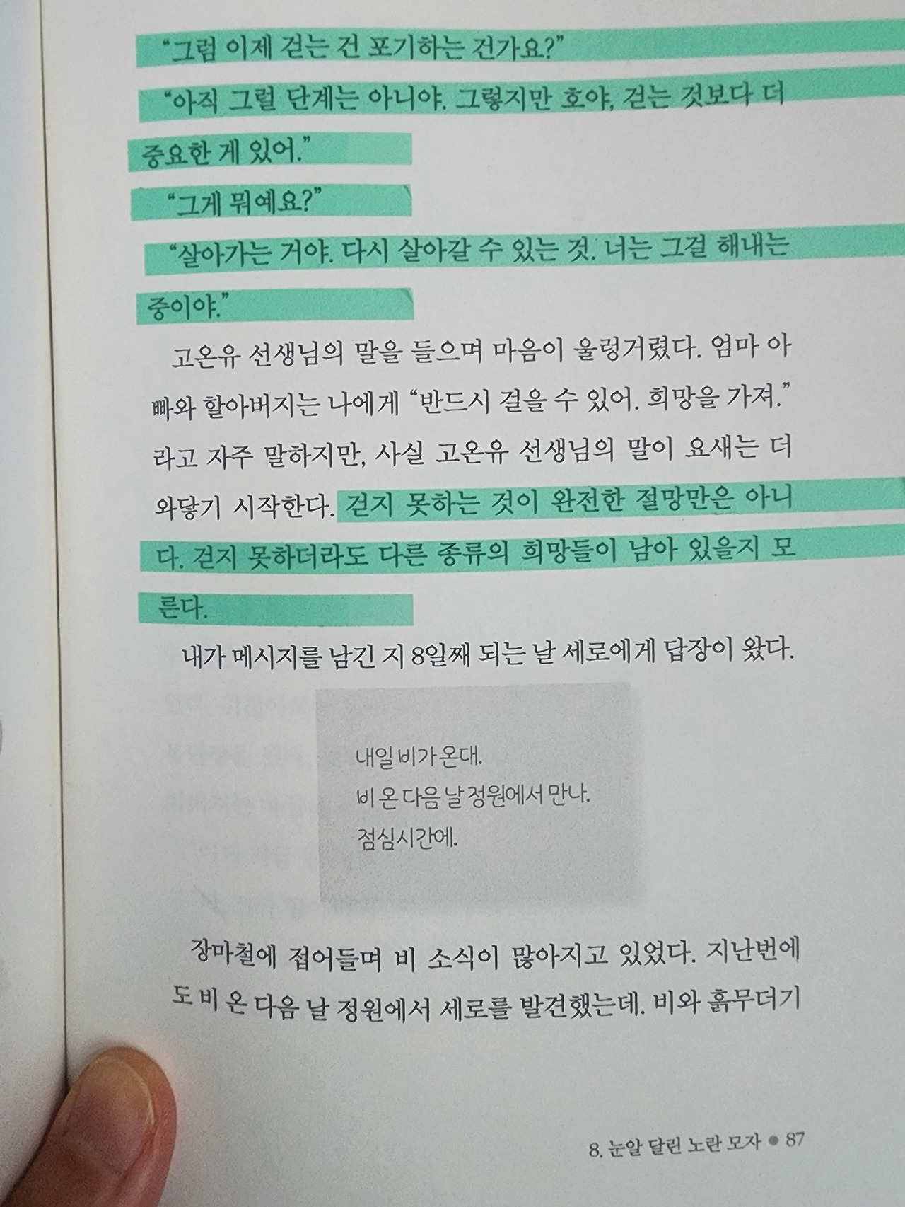 또한, 세로가 생일 소원으로 "중학교 교복을 입을 수 있기를(p.121)" 기도하는 장면은 마음을 먹먹하게 만든다. 평범하게 여길 수 있는 일이 누군가에게는 간절한 소망일 수 있다는 사실은 읽는 이에게 깊은 공감과 깨달음을 안겨준다.