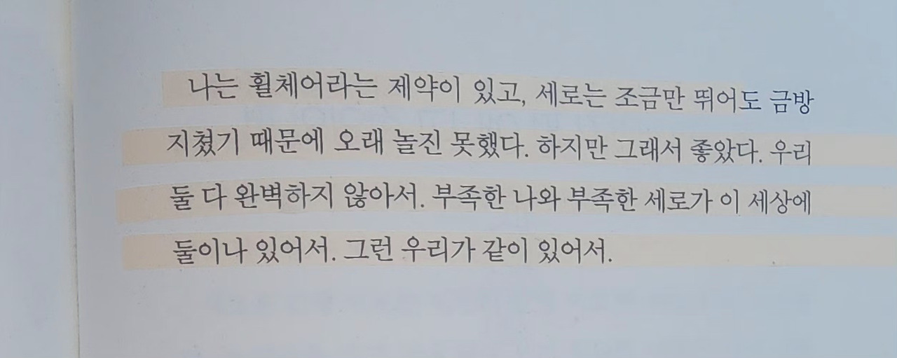 특히 "우리 둘 다 완벽하지 않아서......그런 우리가 같이 있어서(-p.99)"라는 구절은 큰 울림을 준다. 이 문장은 단순한 우정을 넘어, 함께함으로써 더 큰 의미와 희망을 만들어 낸다는 메시지를 전달한다.