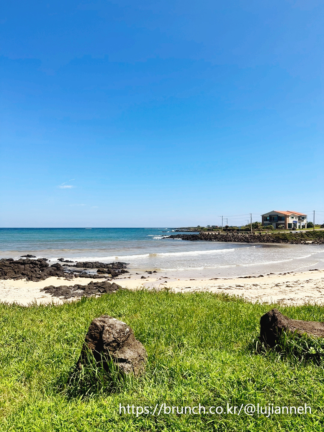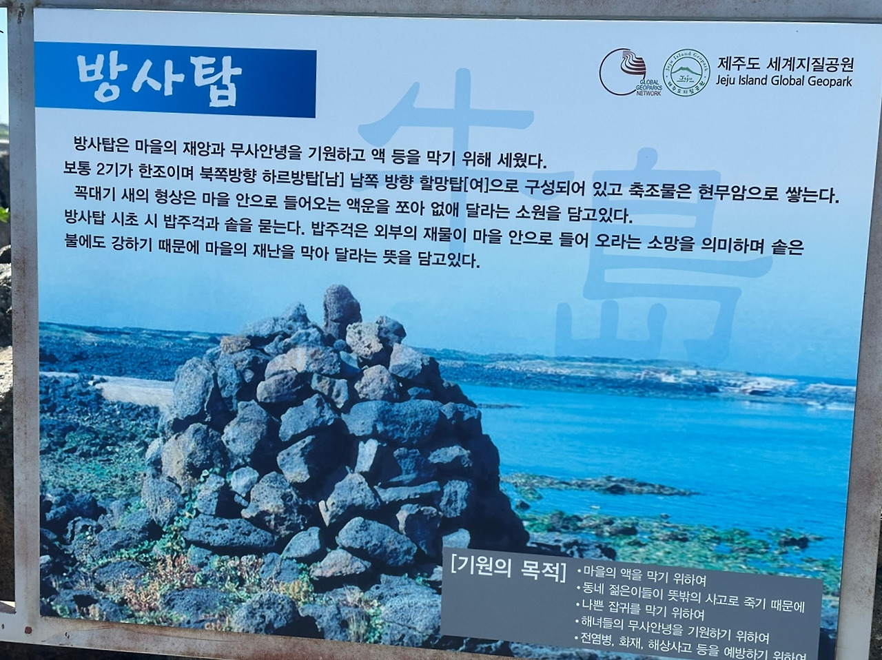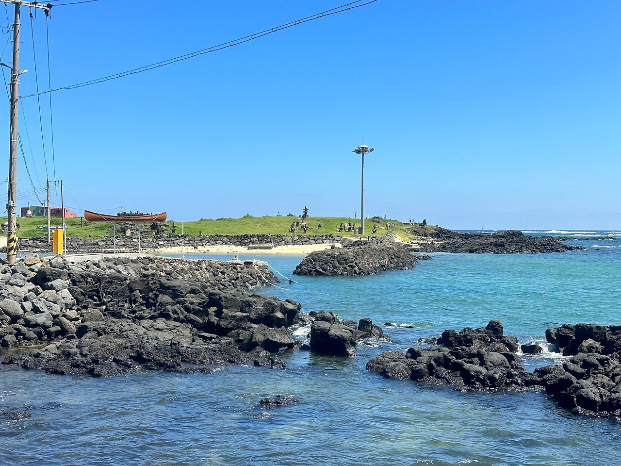 그렇게 풍경도 감상하고 이런저런 생각도 하면서 길을 걷다가 제주 젊은이들의 무사 안전을 기원하는 방사탑을 지나 하고수동 해수욕장에 다다랐다. 사실 하고수동 해변인지도 모르고 걷고 있었는데 해변과 그 주변의 경관이 상당히 이국적이어서 다시 한번 바라보게 되었다. 마침 그즈음 출출하기도 했고.