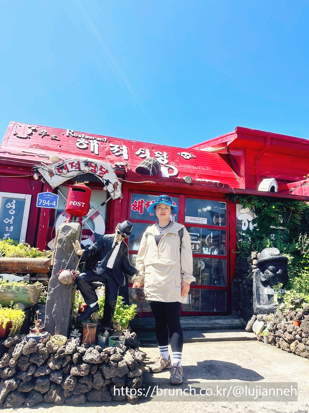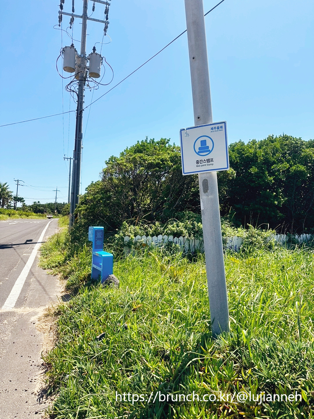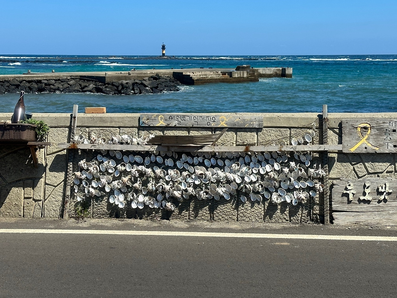 마지막으로 이 집의 시그니처 중 하나인 천원짜리에 소원 써서 천정에 붙이기!! 소원을 써서 드렸는데 사장님이 압정을 꽂으시더니 갑자기 순식간에 천정으로 던져서 한방에 고정시켜 버리신다. 이럴 줄 알았으면 영상 찍을걸.. 어쨌거나 사장님의 한방으로 나의 소원은 우도 해적식당에 잘 꽂혀서 제주의 좋은 기운을 듬뿍 받을 것 같다. 그렇게 맛있게 식사하고 인증샷 하나 찍고 다시 출발한다. 바로 7분 정도 걸으니 중간 스탬프 찍는 곳도 나타났다.