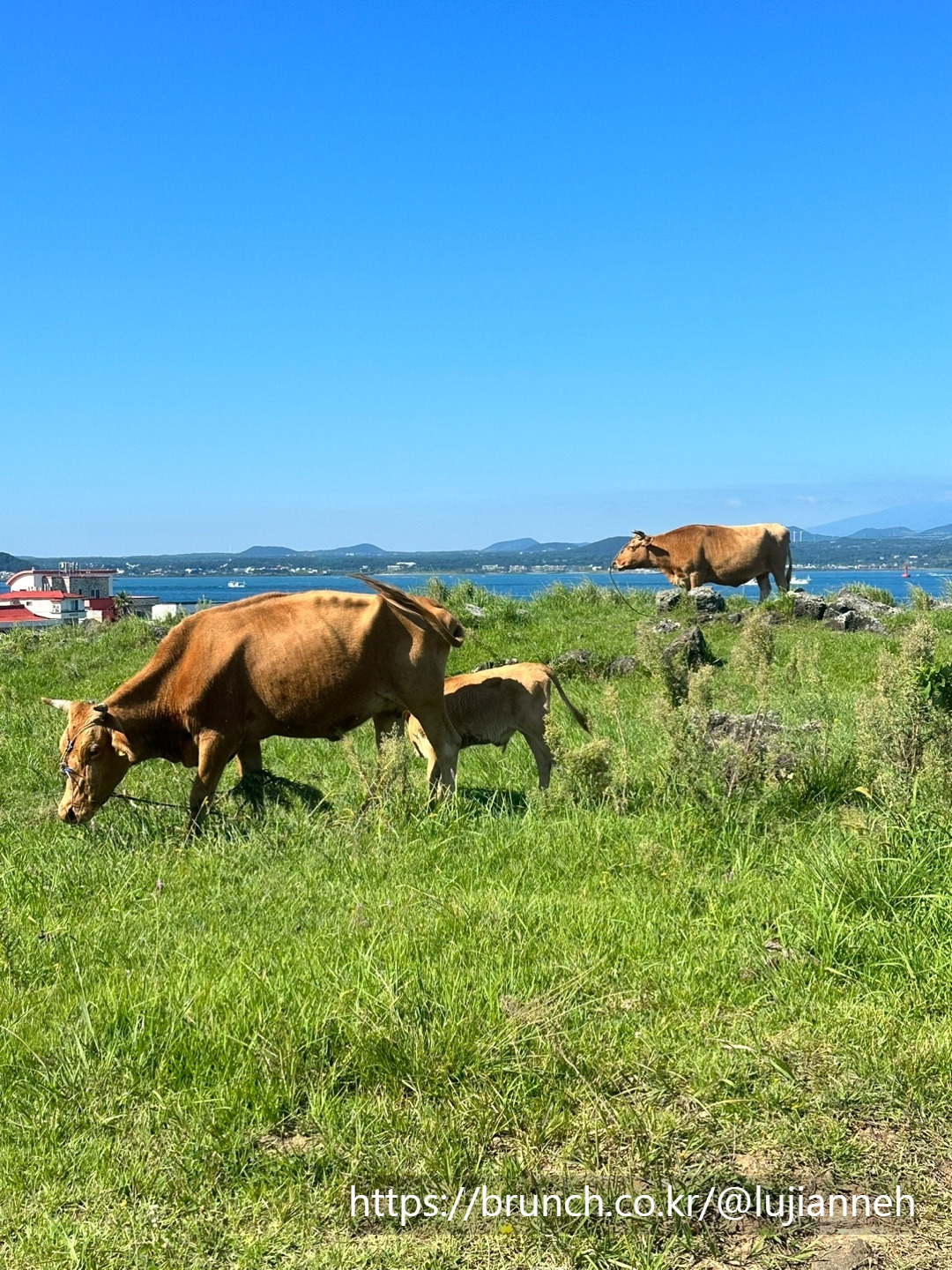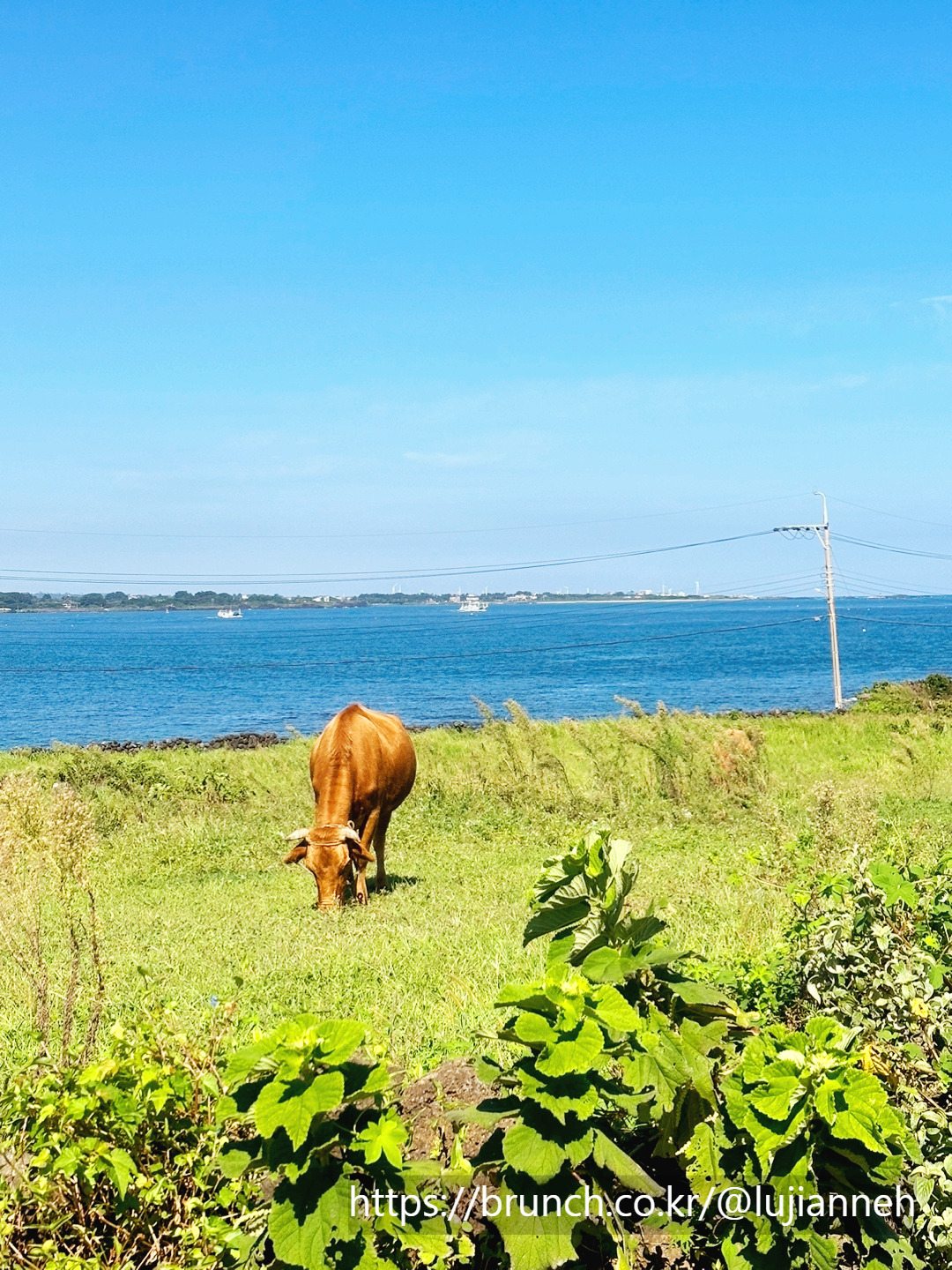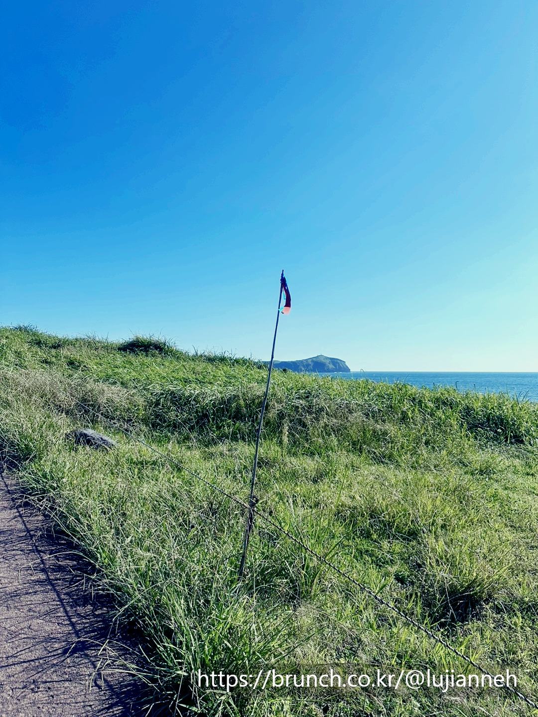 그 풍경에 평화로움을 더하듯이 어미소와 송아지가 서로 꼭 붙어서 한가로이 풀을 뜯고 있다. 이런 풍경을 평일에 오롯이 느끼며 걸을 수 있다니 참 감사한 일이다. 1코스에서는 주로 말을 많이 보았는데 우도 코스는 이름답게 확실히 소들이 먼저 자태를 드러낸다. 사람을 많이 보았는지 소들은 크게 놀라지 않고 유유자적이다.