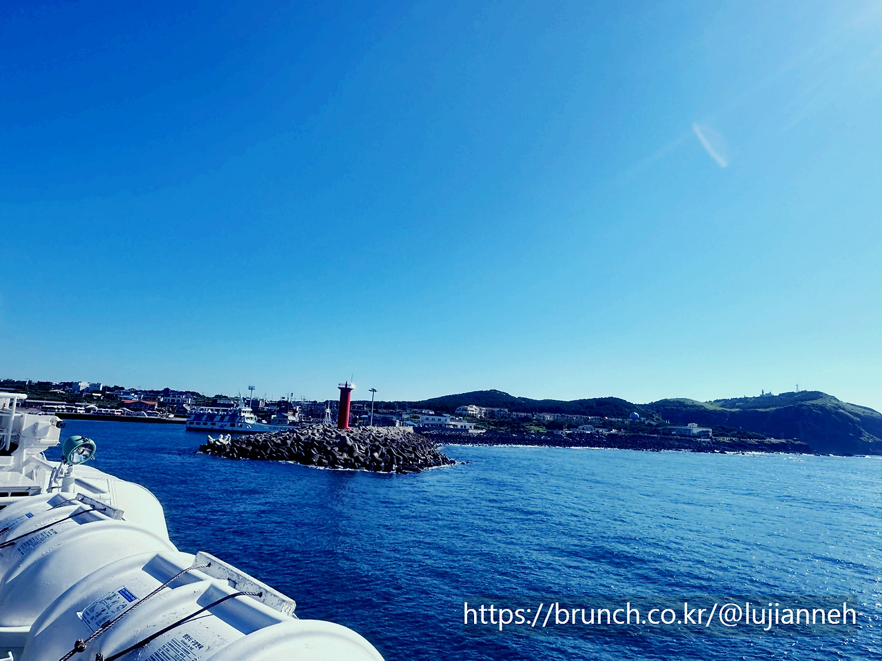 빨간 등대가 눈앞으로 다가서며 우도 천진항에 도착했다.