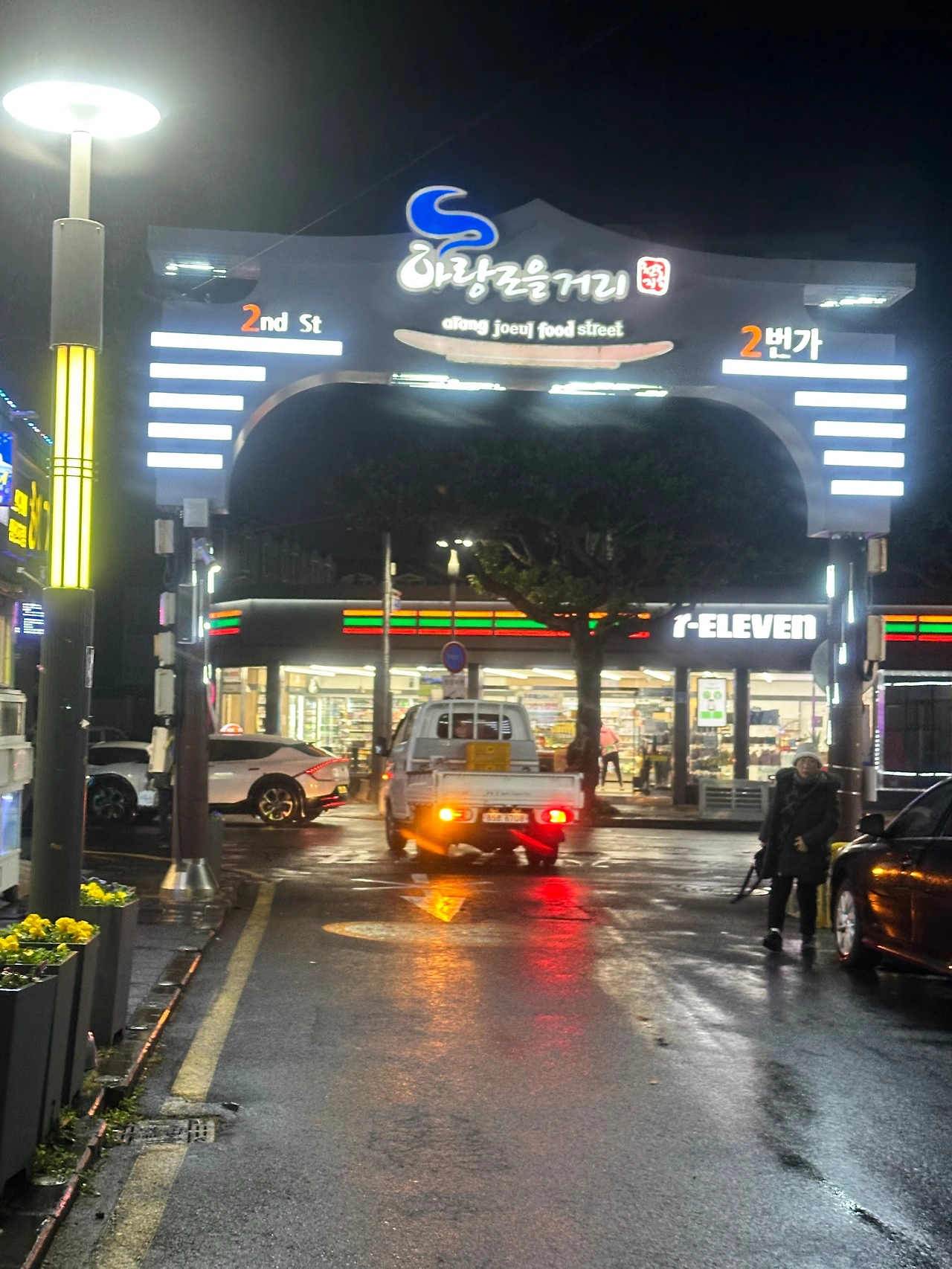 센터(스테이) 주변에는 식당들이 좀 있고 또 "아랑조을거리" 먹자골목이 늘어서 있다. 긴 구간은 아니지만 그곳에서 먹어보기로 하고 식당을 하나 골라 들어갔다. 점심이 넘 가성비가 좋아서인지 저녁은 조금 쏘쏘~ 하지만 하루 일정을 마치고 먹는 따뜻한 식사와 술 한잔이면 그것으로 족하다. 전복뚝배기와 옥돔구이정식에 동행자는 맥주 1병 나는 한라산 소주 1병을 각각 마시고 맥주 한 병을 더 시켜 둘이 나눠 마시면서 이런저런 얘기들을 나누었다. 둘이서 오랜 시간을 함께 활동하기도 하고 지역에서 연대했지만 이렇게 둘이 1박을 같이 해보긴 처음이라 서로 속얘기 들도 조금씩 풀어내면서 담소를 나누었다. 게다가 부슬비도 내리니 나름 운치도 있고 좋다. 시끌벅적함보다 이런 조용함이 나는 좋다.