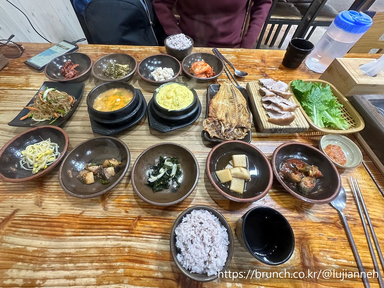 "안거리밖거리"라는 정식집이었는데 12,000원의 식사치고 15종의 음식이 매우 푸짐하고 맛도 있었다. 옥돔고기도 실하고 돔베고기도 잡내하나 나지 않게 잘 삶아졌고 부드러웠으며 된장찌개에 계란찜까지 아주 만족스러운 점심식사였다. (알고 보니 맛집이었다.^^) 우연치않게 맛집을 만나는 일도 길에서의 소소한 즐거움이다.