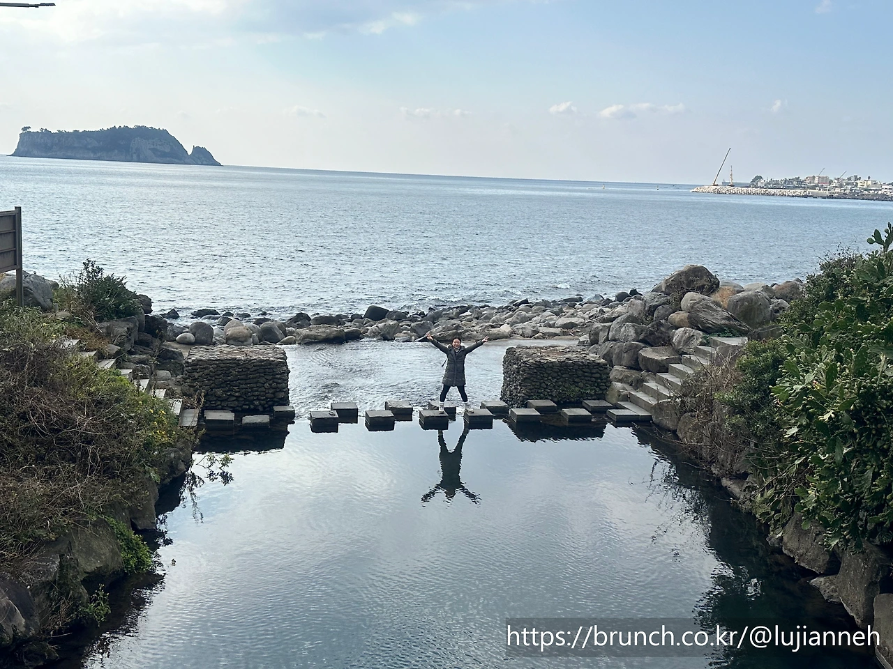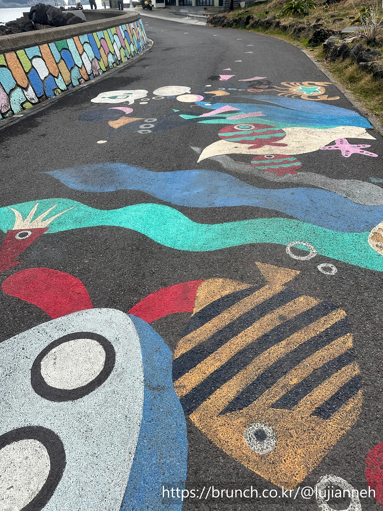 "해녀마켓" 이름이 재미있다. 해녀체험을 하는 곳인데 체험할 때 마켓에다가 여러 가지 해산물을 풀어놓는가 보다. 바닷길을 하나하나 돌을 옮겨 가면서 조성했다고 한다. 기상이 안 좋을 때는 우회해야 하는 지점들이다.