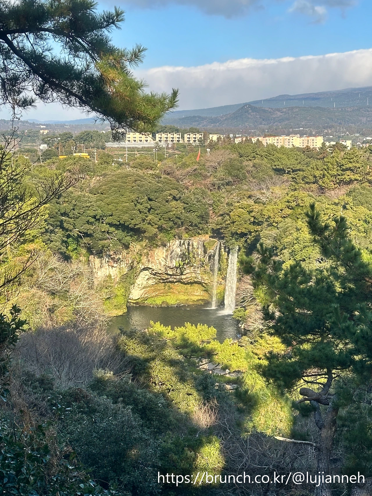 올레스테이를 등지고 왼쪽으로 걷기 시작한다. 걸어 내려와서 길을 건너 큰 공원으로 들어가는데(공원이름이 칠십리 공원이었던 것 같다.) 공원 안에서는 멀리 천지연 폭포도 볼 수 있다.