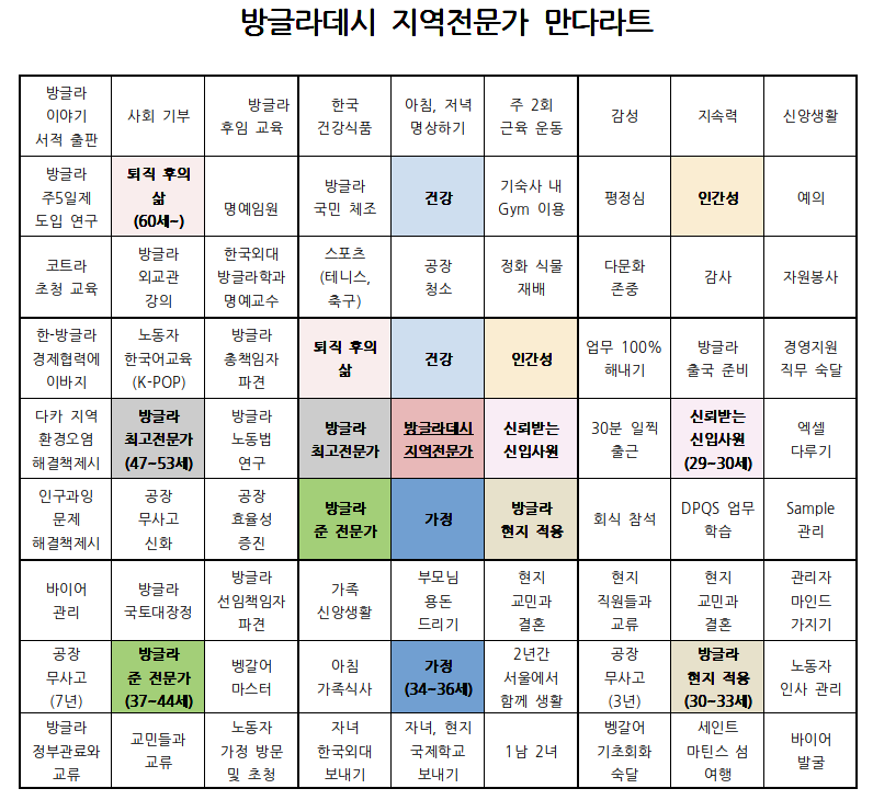오타니의 형식을 그대로 가져와서 '방글라데시 지역전문가'를 상위 목표로 변경하고 나만의 만다라트를 완성했다. 이를 위한 아홉 개의 하위 목표로는 시기별로 신뢰받는 신입사원, 방글라 현지 적응, 방글라 최고전문가, 퇴직 후의 삶을 포함했다. 실행 목록으로는 30분 일찍 출근, 벵갈어 숙달, 현지 국토 대장정, 현지 노동법 연구와 같은 깊게 고민한 흔적을 남기려 애썼다.
