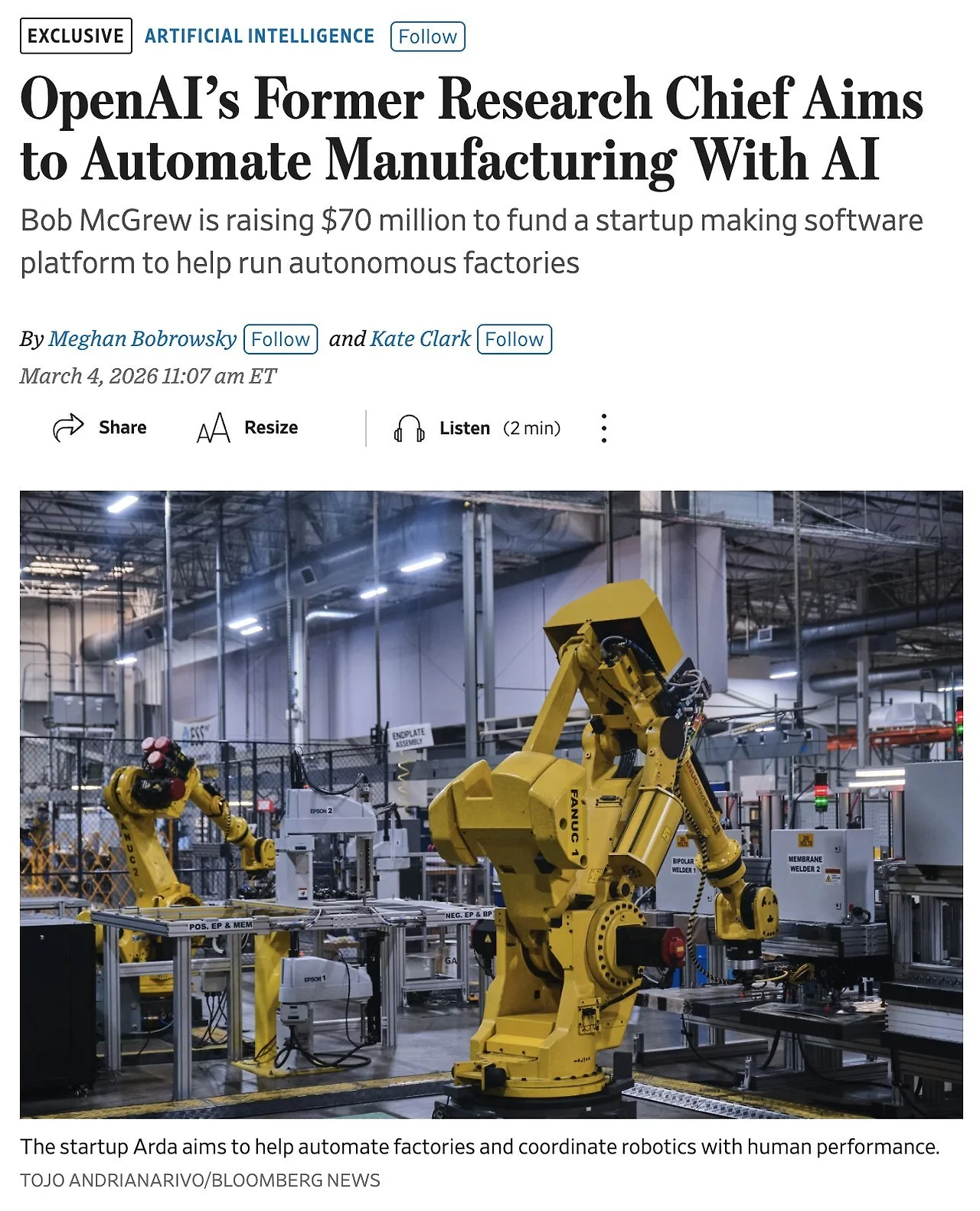 OpenAI의 전 최고 연구 책임자 밥 맥그루가 ’Arda’라는 제조 자동화 스타트업을 창업하고, 7억 달러 밸류에이션으로 7천만 달러 펀딩을 조성 중이라는 내용이다. 파운더스 펀드와 악셀이 공동 리드, 코슬라 벤처스와 XYZ 벤처캐피탈이 참여했다고 한다.