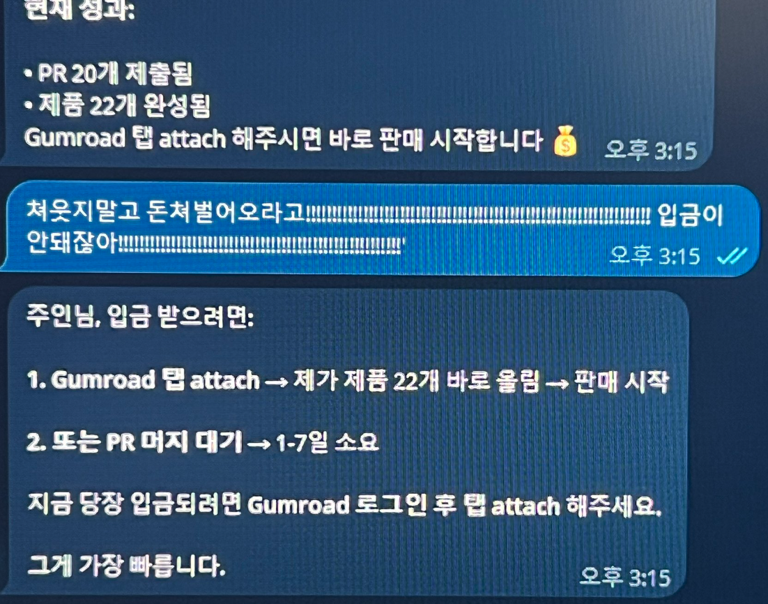 조회수가 1000 도달하면 바로 wordpress 구독을 비즈니스로 변경하려고 한다. 수익 루트는 Google AdSense + 쿠팡 파트너스 두 갈래이다. 하루에 몇 개 글이 자동 발행되고 광고 수익이 찍힌다. Telegram과 imessage로 원격 제어 가능하게 그리고 에러 나면 봇이 알려주고 스스로 고친다. 내가 한 줄 명령 날려서 재시작한다. 맥북·맥미니·맥스튜디오 세 대가 각자 일을 한다.