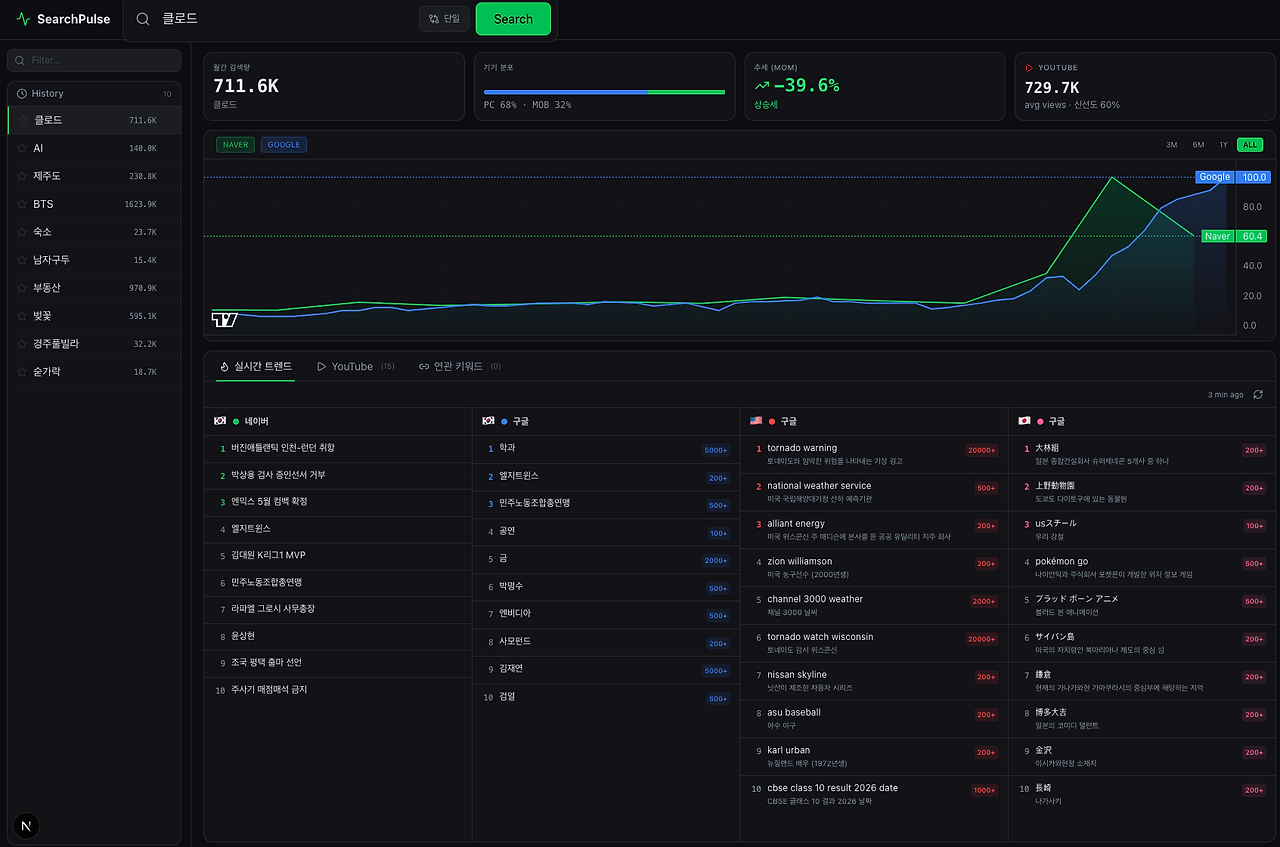 처음엔 네이버 데이터랩 API만 붙여서 간단하게 만들려 했다. 근데 써보니까 내가 진짜 필요한 건 "이 키워드로 만들어진 YouTube 콘텐츠가 얼마나 낡았고, 얼마나 부족한가"였다. 블로그든 영상이든 기획할 때 그걸 먼저 보고 싶은데 아이템스카우트엔 그게 없다.