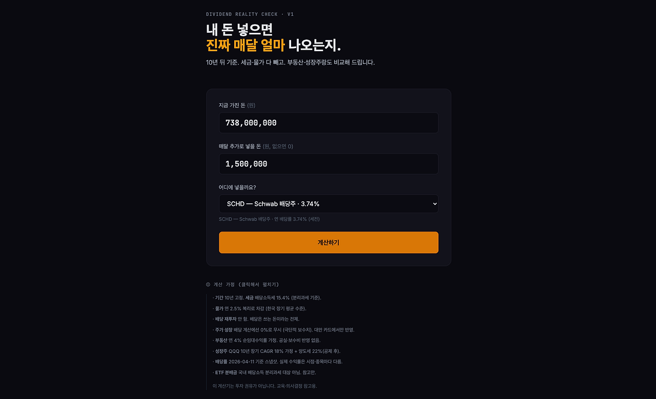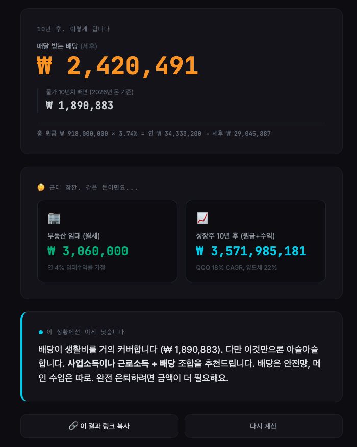 그래서 정확하게 세금·물가·부동산 대안·성장주 대안을 한꺼번에 넣고 굴려주는 도구가 필요했다. 그래서 직접 크롤링을 시켜서 30개 배당주·ETF 데이터 박아놓고, 10년 기간으로 세후 배당금 / 실질 구매력(물가 2.5% 복리) / 부동산 대안 / QQQ 대안을 한 번에 비교할 수 있도록 했다.