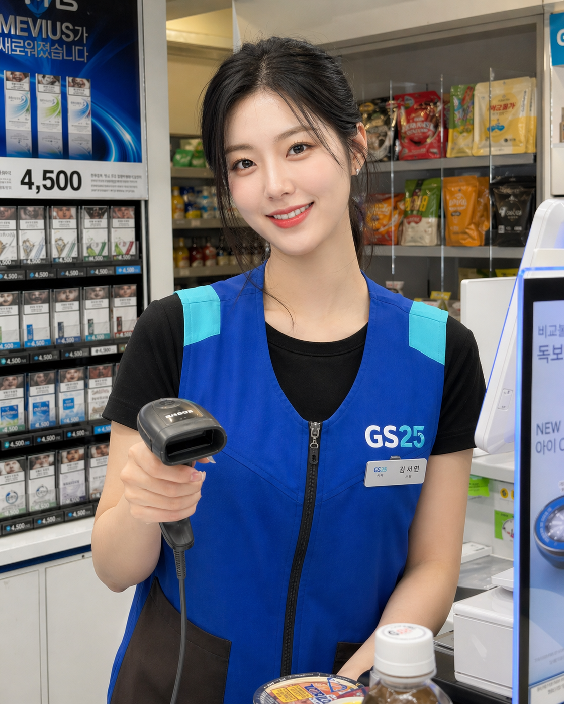 "GS25 편의점 계산대에서 일하는 아주 예쁜 여성 알바생 사진처럼 만들어줘. 검은 머리를 묶고 있고, 파란색 유니폼을 입고 바코드 스캐너를 들고 있게"