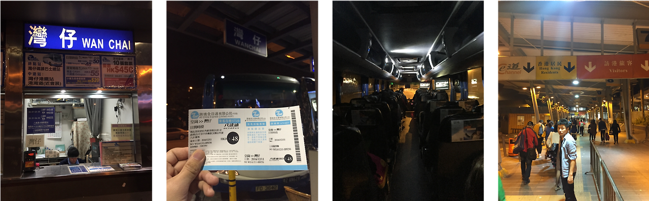 48 HKD 주고 완차이까지 오는 버스를 타면 되는데, 중간에 한 번 여권 검사 때문에 내렸다가 타야 되는 게 좀 귀찮기는 하지만 지하철에 비하면 훨씬 편하다.