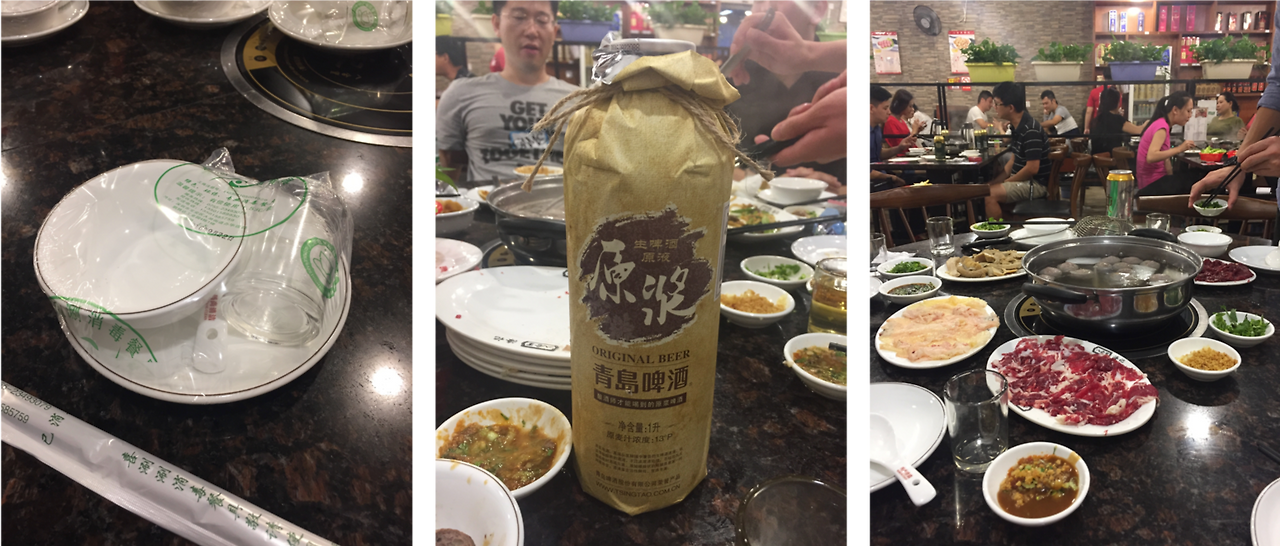 특히 심천이나 광저우 지방이 이런 것 같은데, 왼쪽 사진과 같이 음식점에 가면 컵과 접시가 뜨거운 물과 함께 나온다. 봉지에 쌓여 있기도 하고, 봉지 없이 그냥 주기도 한다. 우리 같은 외국인들은 그냥 나오는 차인 줄 알고 바로 따라서 마시기도 하는데, 이게 사실은 뜨거운 물에 식기들을 한 번 씻으라는 용도라고 한다. 뜨거운 물로 컵과 접시를 한 번씩 헹구고 나서 가운데 대야 같은데 부어서 버리면 된다. 이게 광동 스타일이라고 한다.