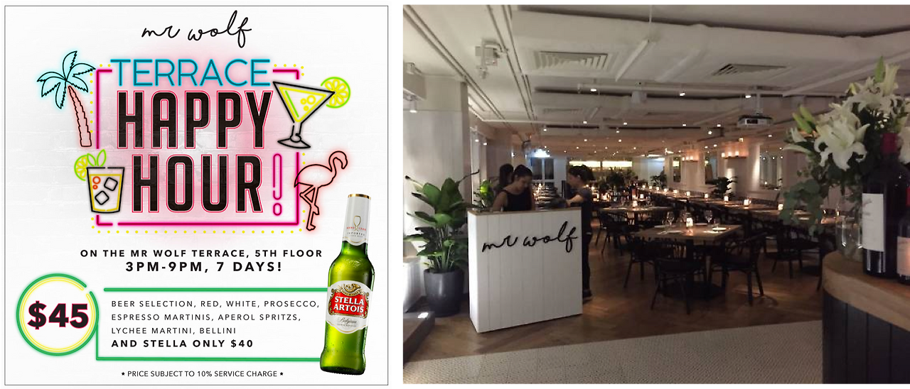 대부분의 술집이 'Happy Hour'가 적용되니, 그냥 괜찮은 술집이다 싶으면 알아서 찾아가면 되는데, 내가 특히 자주 갔던 곳은 Central 쪽에 있는 'Mr. Wolf'라는 곳이다. 센트럴에 있는 ZARA와 COS 근처에 있는 바 겸 레스토랑인데, 분위기도 괜찮고 맥주뿐만 아니라 다양한 종류의 술들을 'Happy Hour'로 해줬다.