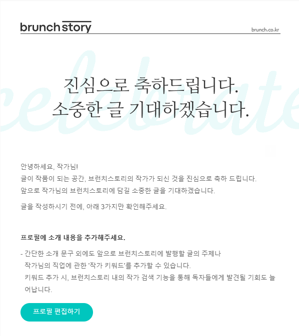 도서관에서 글쓰기 수업을 듣고 쉬는 시간에 핸드폰을 확인해 보니 브런치 앱에 조그마한 알림 표시가 떠 있었다. 단숨에 앉은자리에서 서둘러 앱을 클릭했고 합격을 확인했을 때 온몸에 느껴지던 그 짜릿한 전율은 지금도 잊을 수가 없다. 얼굴에 숨길 수 없는 기쁨의 미소가 번졌진 것은 당연지사다.