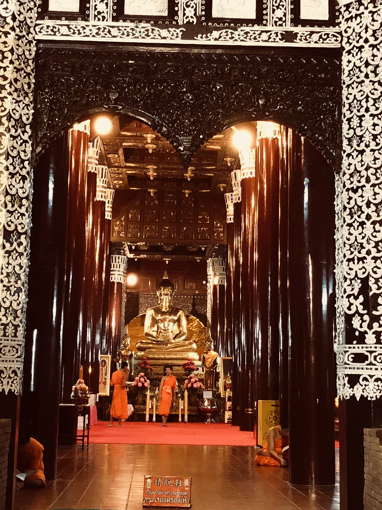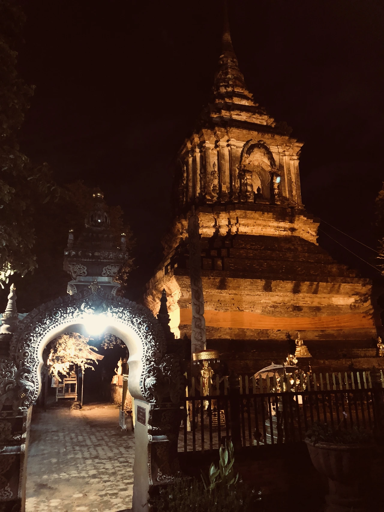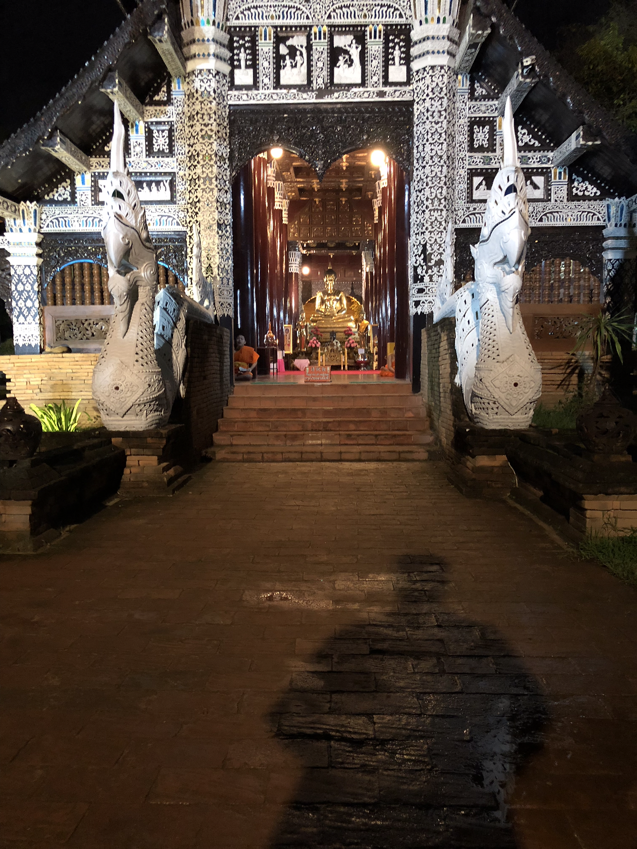 오래된 성벽의 해자를 따라 싸목싸목 집으로 걸어가는데 불 켜진 사원이 눈에 들어왔다. 그러고 보니 아직 사원에 들어가 본 적이 없구나. 구글 지도로 찾아보니 Wat Lok Moli 라는 이름이다. 몇 걸음 지나쳤다가 어쩐지 사람 없는 밤의 사원에 들어가 보고 싶은 기분이 들어 지나친 걸음을 되짚어 갔다.