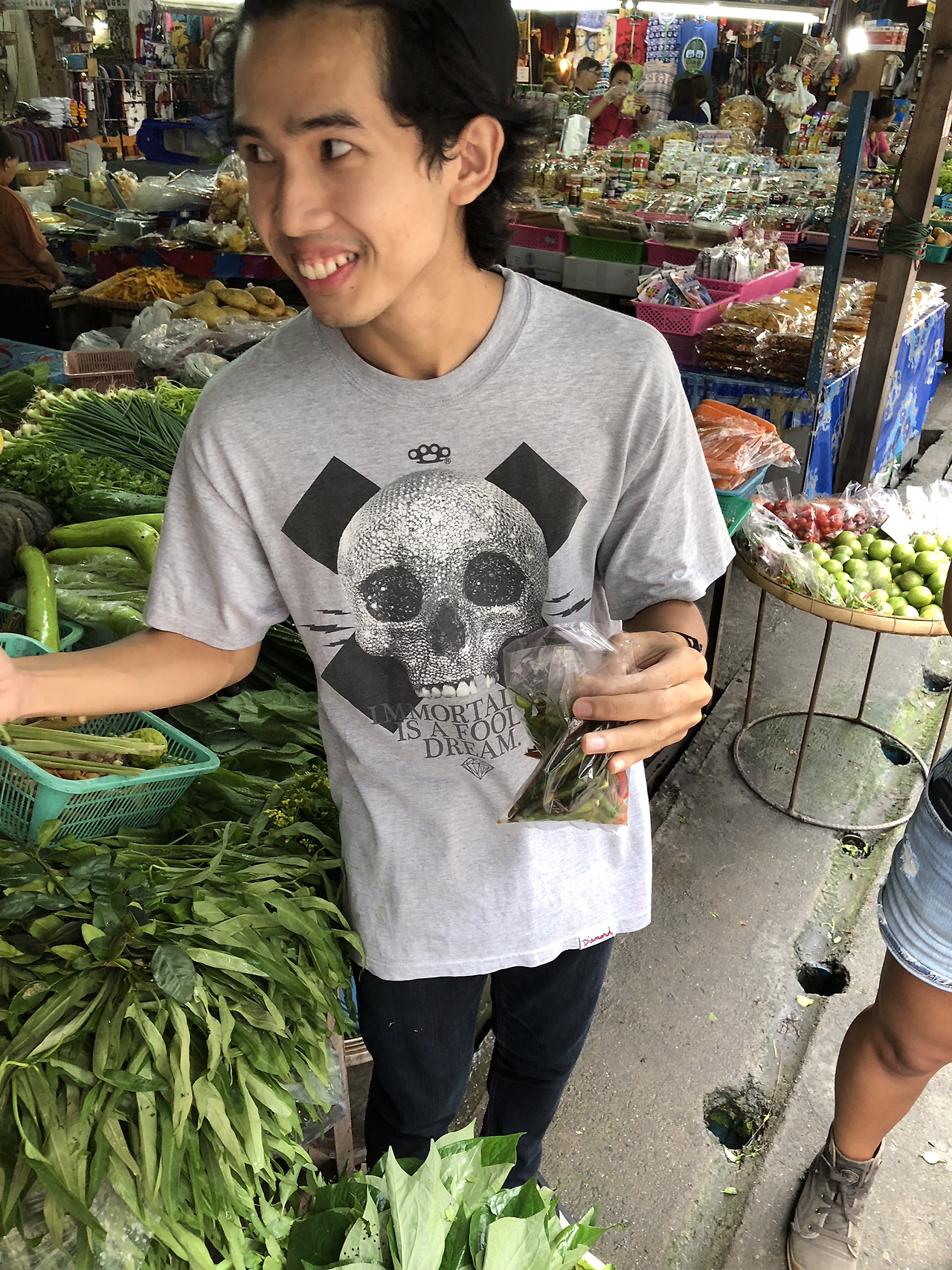 프랑스 커플 2명, 캘리포니아 엄빠딸 3명, 한국맘 화영 누님과 7살짜리 이삭이 더하기 나까지 모두 픽업을 마치고 밍무앙 시장에서 식재료 설명으로 클래스 시작.
