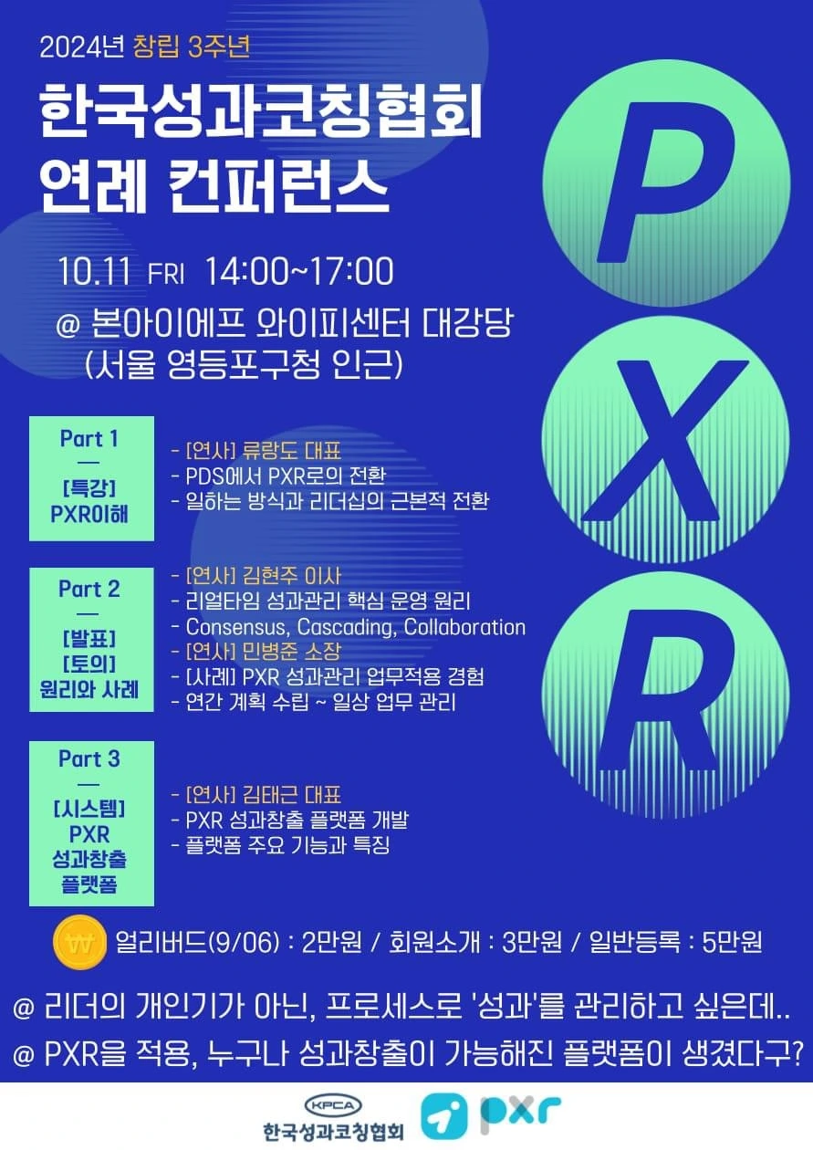 ※ PXR: 한국성과코칭협회의 축적된 성과창출(성과 관리와 코칭) 방법론을 지칭하는 단어로 Preview, causal eXecution, Review에서 가져와 만든 브랜드.