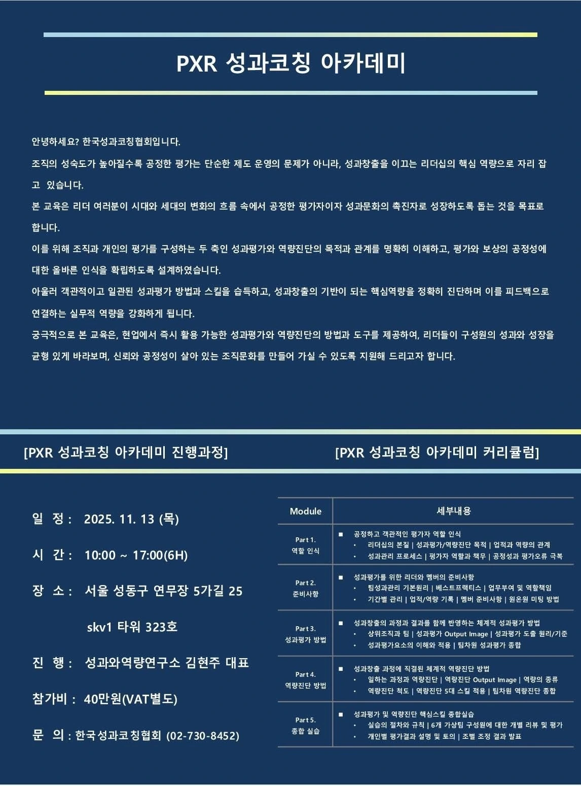 연말 평가 시즌이 다가오고 있습니다. 다음달 11.13일(목)에 한국성과코칭협회(성수역)에서 특별히 기업과 기관의 재직 리더를 위한 평가자 교육(6시간)을 준비했습니다.