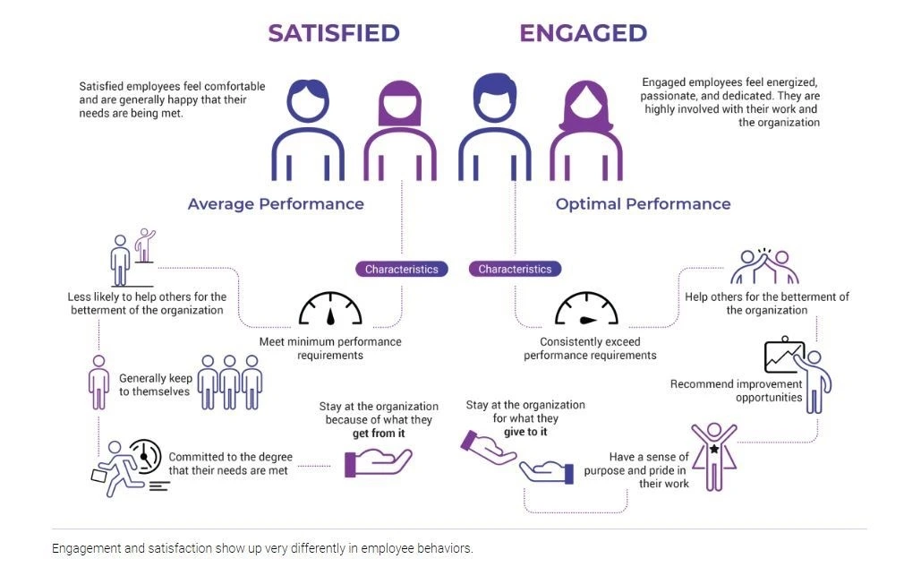 한 글로벌 HR 연구기관의 조사에 의하면 만족한 직원과 열의한(몰입한) 직원은 상당히 다른 행동 패턴을 보인다고 한다. 그림 참조.