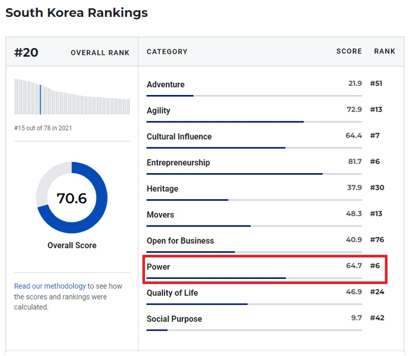 한국은 국력 부문에서 수출 호조 84점 경제적 영향 79.8점 군사력 79.1점 국제 외교 66.4점 등 좋은 점수를 받았다. 정치적 영향력(48.6점) 리더십 역량 (22.5점)에선 다소 낮은 점수를 받았지만 종합점수 64.7점으로 6위를 기록했다.