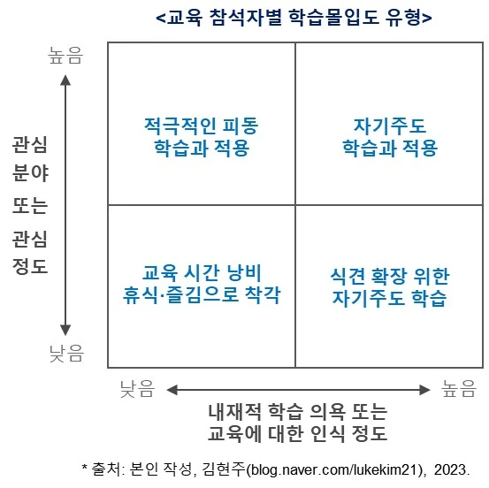 3. 짧지 않은 세월 동안 강의자로서 교육부서장으로서 다양한 기업과 기관에서 교육을 기획하고 운영하고 진행해보니 학습자별 학습몰입도의 유형을 다음과 같이 구분할 수 있었다.