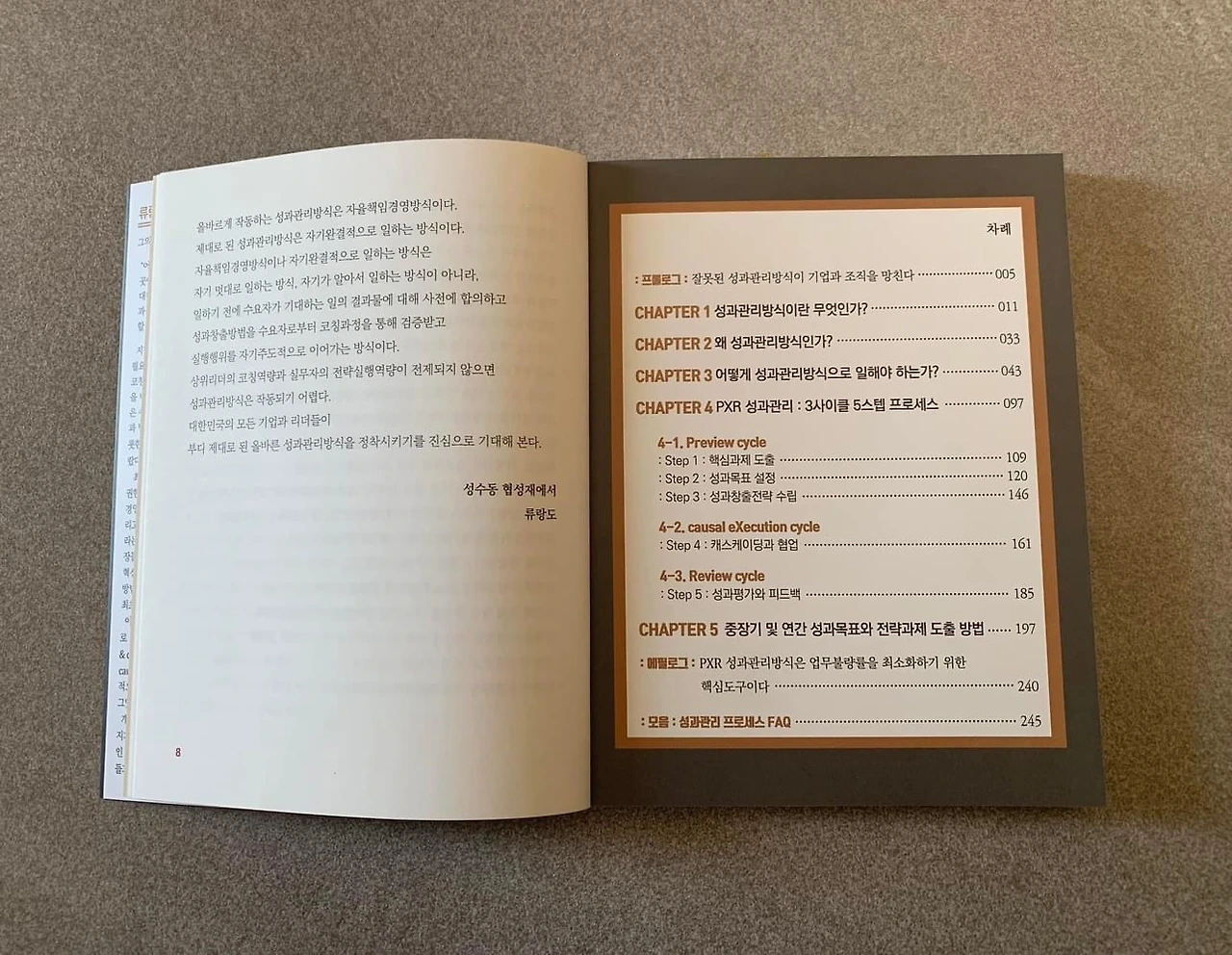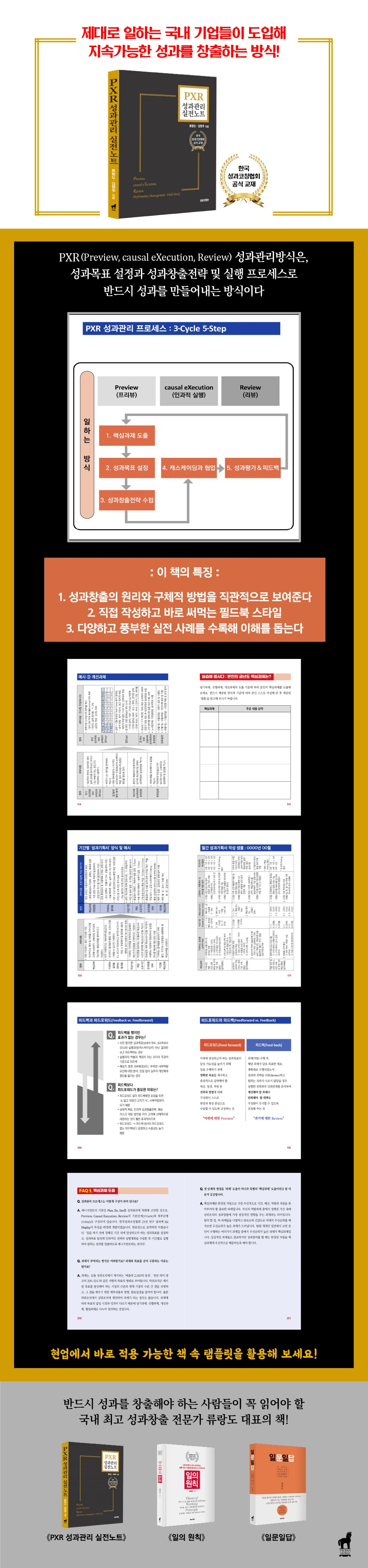 대부분의 책 내용을 기본 개념과 실천 방법론과 함께 그에 관한 실물과 사례로 구성했지요. 이를 통해 독자들이 성과 관리와 코칭의 전체 그림과 흐름을 놓치지 않으면서, 중점적으로 보고 싶은 부분부분에 초점을 두어 활용할 수 있도록 최대한 고려해서 집필해 보았습니다.