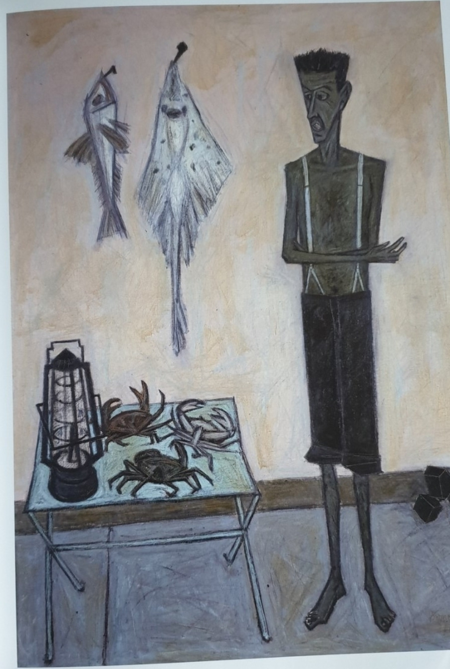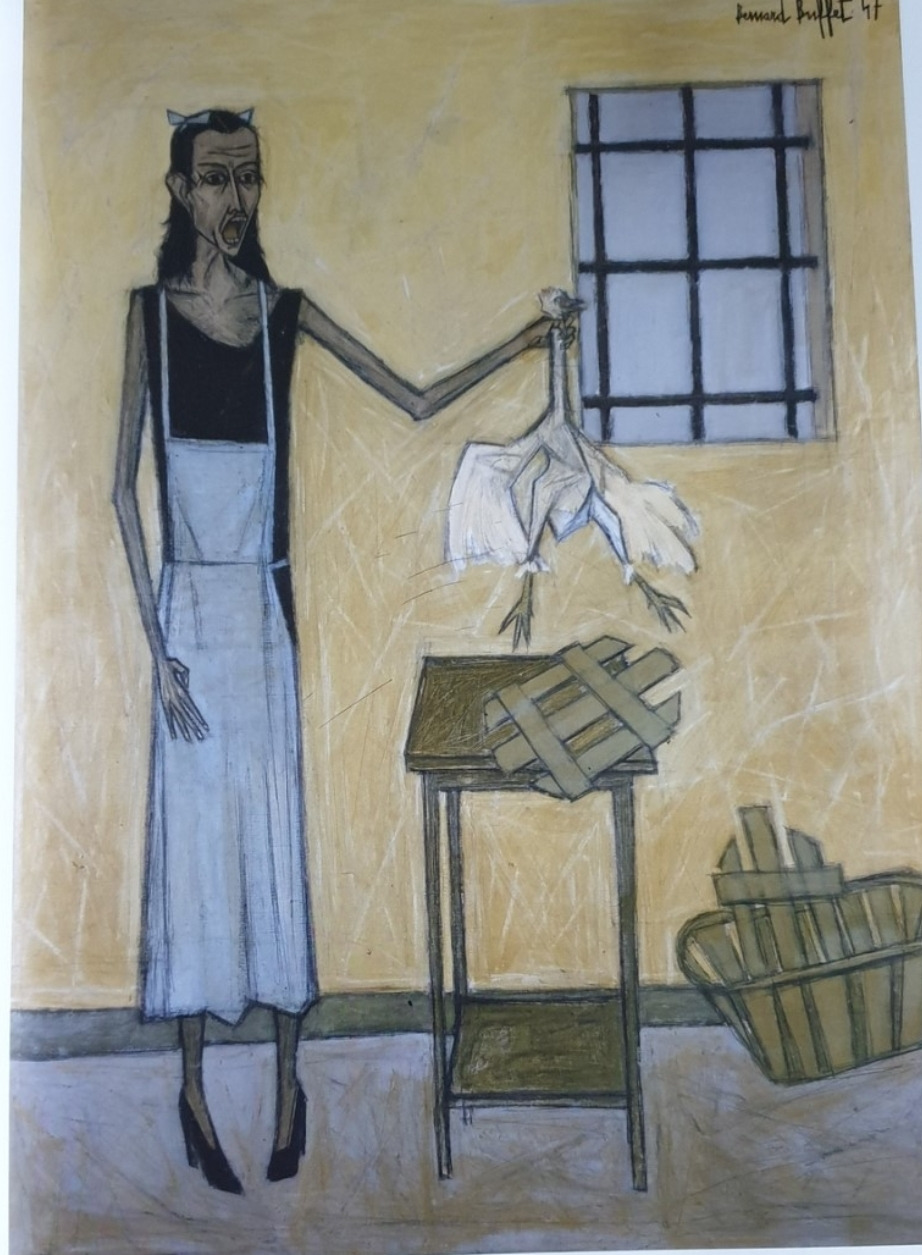 뷔페가 실험 정신이 한창 높던 1947년 그린 <꽃게와 남자>과 <닭을 들고 있는 여인>을 보면 세잔의 다중 시점 기법이 엿보입니다. 테이블이 다른 정물에 비해 시각이 완전히 다르죠.