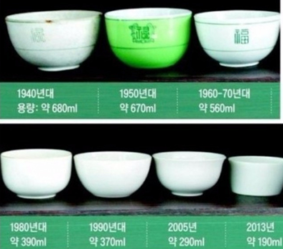 맨 위의 사진에서도 보듯이 밥 외에는 반찬이 없다. 그저 간장과 간단한 채소반찬 뿐이다. 그러니 금세 영양분이 소진되어 노동을 위해서는 계속해서 먹을 수밖에 없었다. 밥공기를 보면 최근 70년 동안 4분의 1로 급격히 줄었다. 현대에는 그 축소 속도가 더 빨라지고 있다. 이유는 밥 외에 반찬이 탄수화물 외 지방과 단백질로 고열량이고 이런 식사 말고도 고칼로리의 식사대용이 흘러넘치기 때문이다.