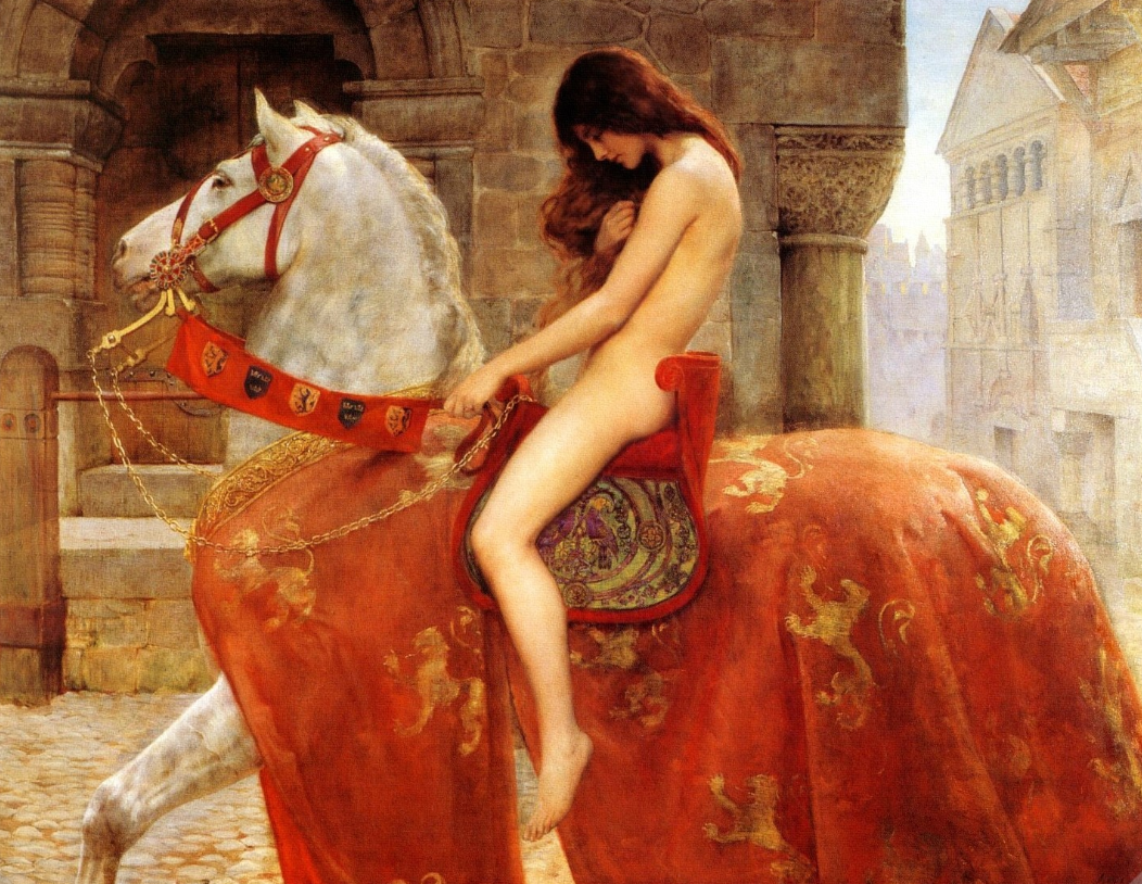 세상 물정을 모르는 철딱서니 없는 여인인지, 아니면 어느 정의로운 책을 읽다 돈키호테식 망상에 빠진 것인지, 알 수 없지만 고디바 부인은 결국 여종 하나가 말을 끌게 하고 자신은 발가벗은 채 말에 올라 코벤트리 시내를 돌았다. 실 오라기 하나 걸치지 않고 팔과 머리카락으로 온몸을 가린 채 나체로 시내를 돌았다.