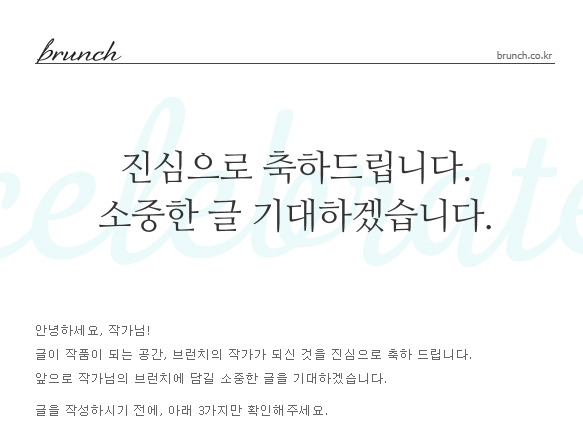 빼곡한 광고 메일 속에서 누군가의 메일을 기다린 적도 없었다. 이 한 통의 이메일이 뭐라고. 오랜만에 진짜 편지를 받은 것처럼 미소 지어졌다. 이제 모든 조건은 갖추어졌다. 컴퓨터로도 스마트폰으로도 언제나 부담 없이 글을 쓰고 싶어 졌다. 대신에 브런치의 작가라는 직책을 받은 만큼, 인터넷 게시판에 쓰는 글이나 순간의 기분을 남기는 덧글과는 달리 글을 쓰고 다시 한번 읽어보게 된다. 스스로 글쓰기에 빠져들었다. 기껏해야 회사에서 기안문 작성이 글쓰기의 전부였는데, 내가 하고 싶은 이야기를 내 맘대로 쓴다. 진부하고 답답한 기안문형 단어들(추진, 계획, 결과, 보고, 효과, 효율, 제고, 구축, 성과, 달성...)에서 정말 벗어나고 싶었나 보다. 그동안 네이버 메모 어플을 통해 틈틈이 남겨둔 기억을 끄집어 매일매일 즐겁게 사진과 글을 남겼고, 한 달 채 안되어 브런치 매거진에 30개의 글이 채워졌다.