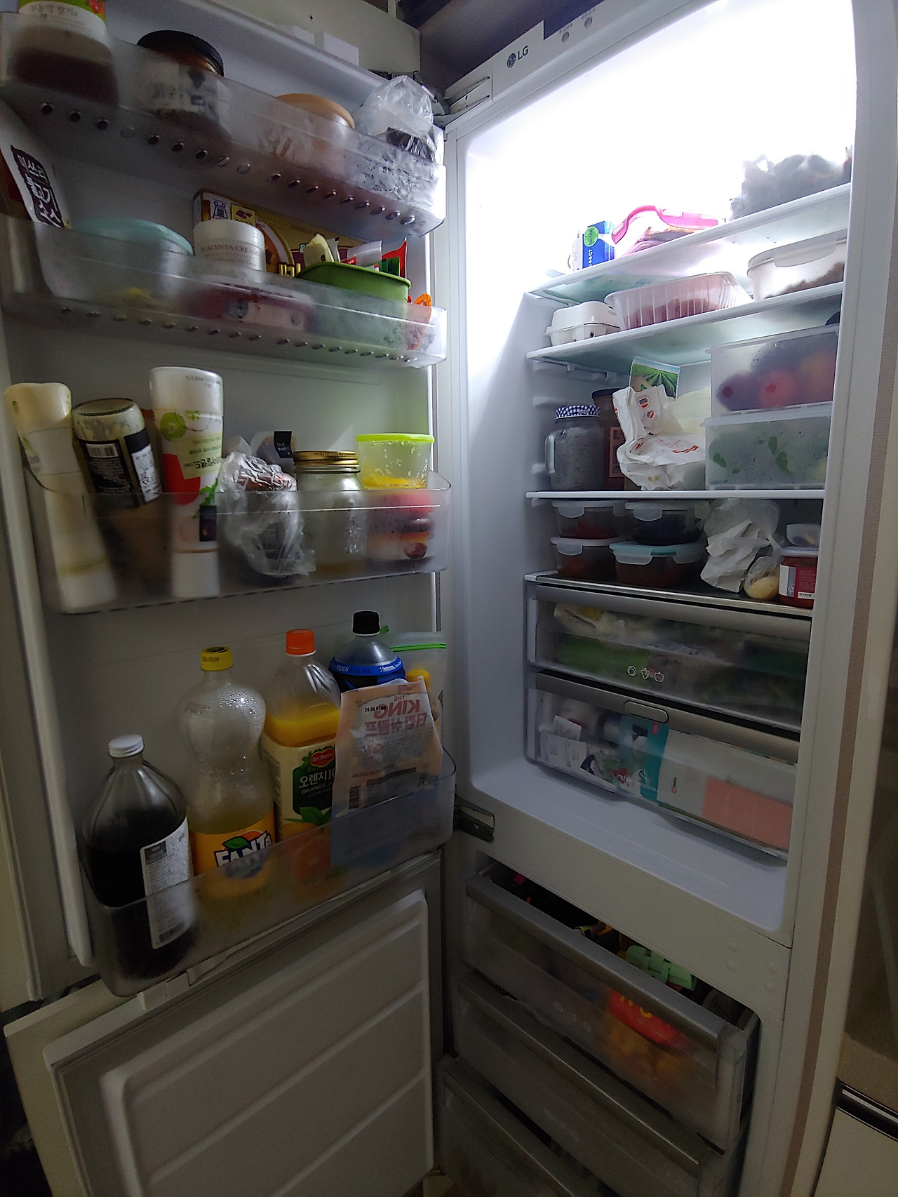 [이사 후] 255L 빌트인 냉장고 (냉장고 불빛이 음식에 다 가려져 어두웠던 이사 직후에 그나마 가까운 사진)