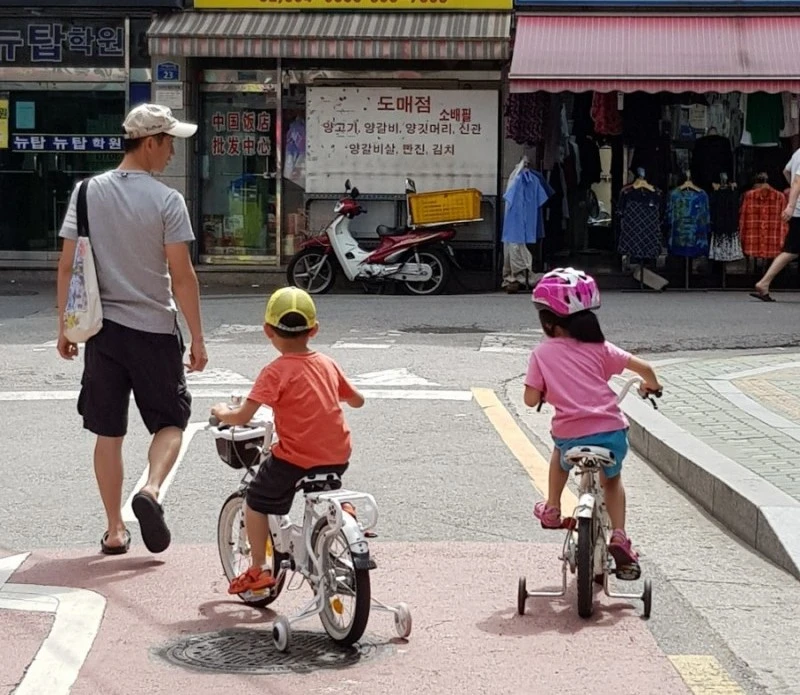 아이들이 6살 때 처음으로 네발자전거를 탔다. 네발자전거인데도 아이들이 넘어질까 걱정되어 헬멧, 팔 보호대, 무릎보호대 등 안전장치를 풀로 세팅하고 근처 학교 운동장에서 자전거 타는 방법을 가르쳐줬다. 네발자전거지만 혹시나 넘어질까 다칠까 아이 뒤를 졸졸 쫓아다녔다. 아이들이 네발자전거의 페달을 아무리 힘껏 돌려도 빠르게 걸으면 쫒아갈 수 있었다.