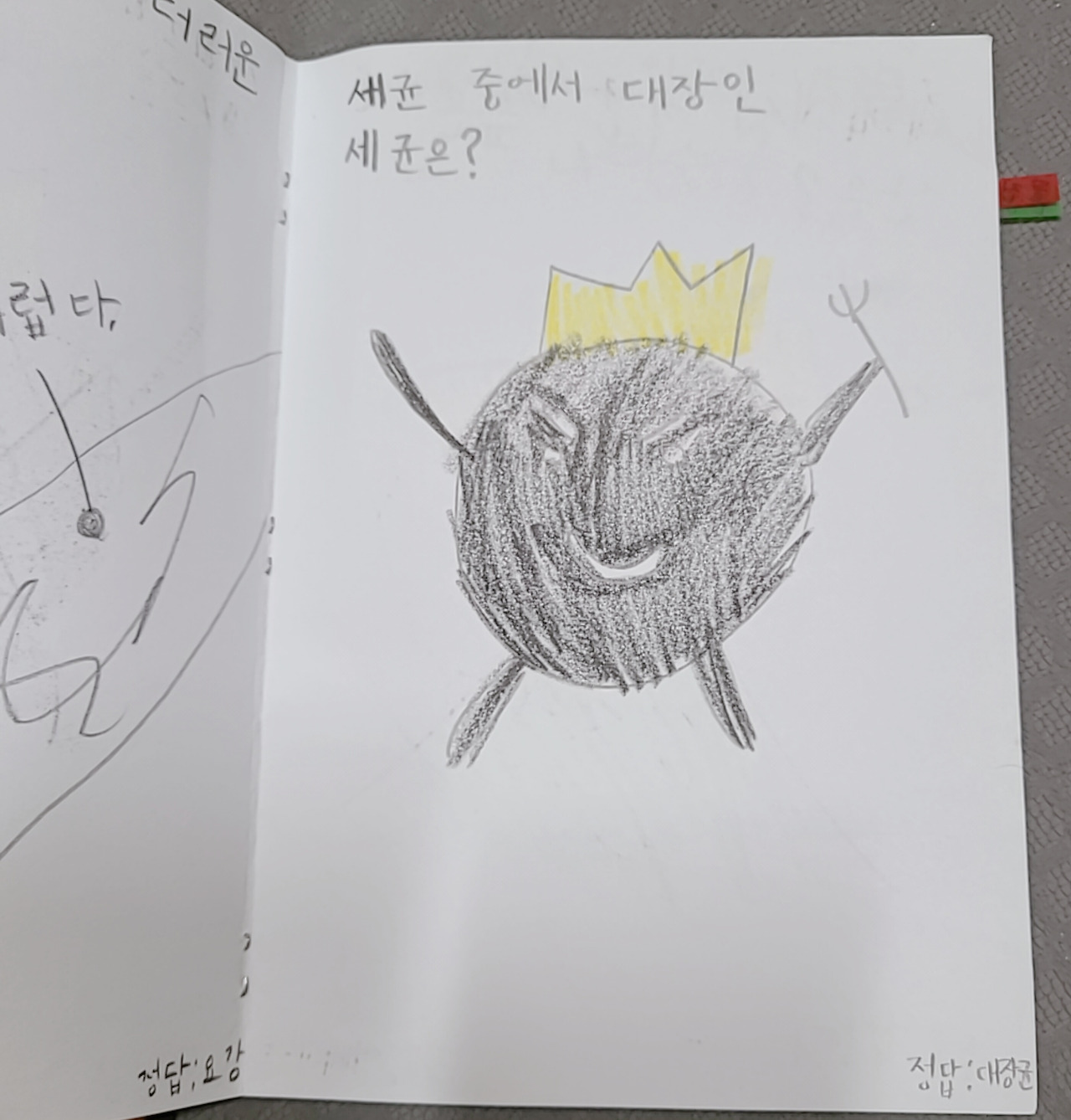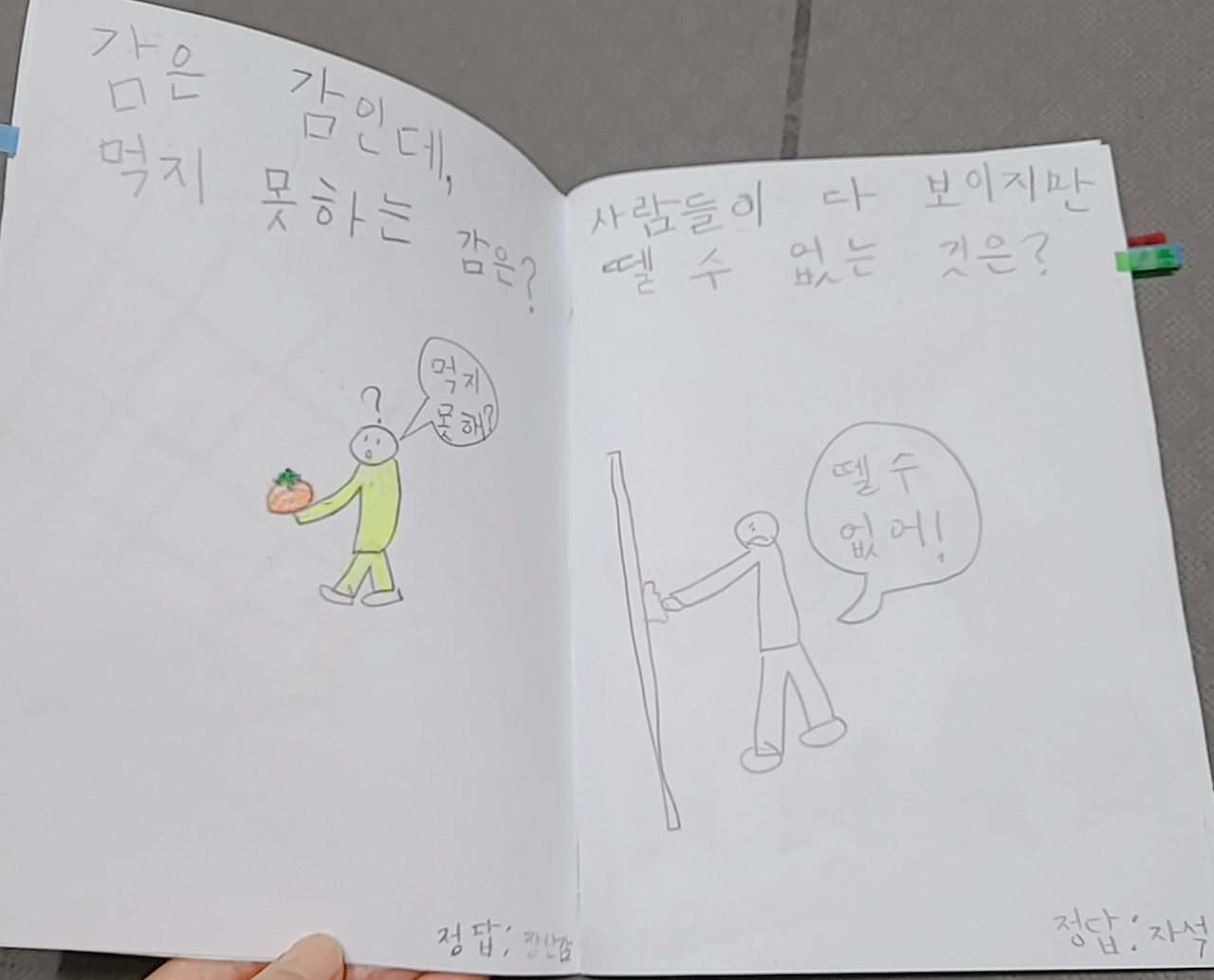 딸아이 또한 자신이 만든 수수께끼 책으로 아빠가 문제를 내주니 기분이 좋은지 깔깔거리며 답을 맞혀 나간다. 딸아이가 좋아하는 모습에 남편은 그만두지도 못하고 계속 문제를 내달라는 딸아이의 재촉에 다음 문제를 낸다.