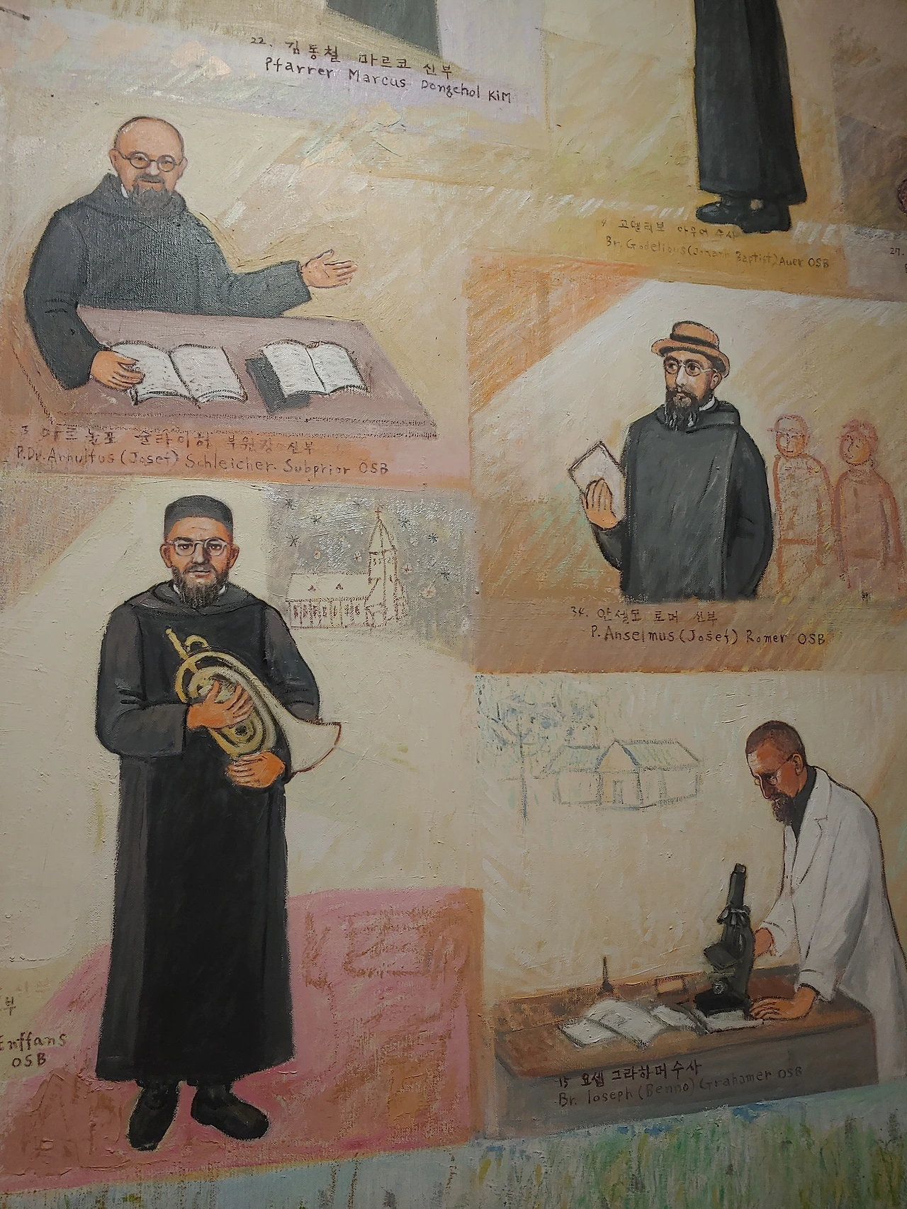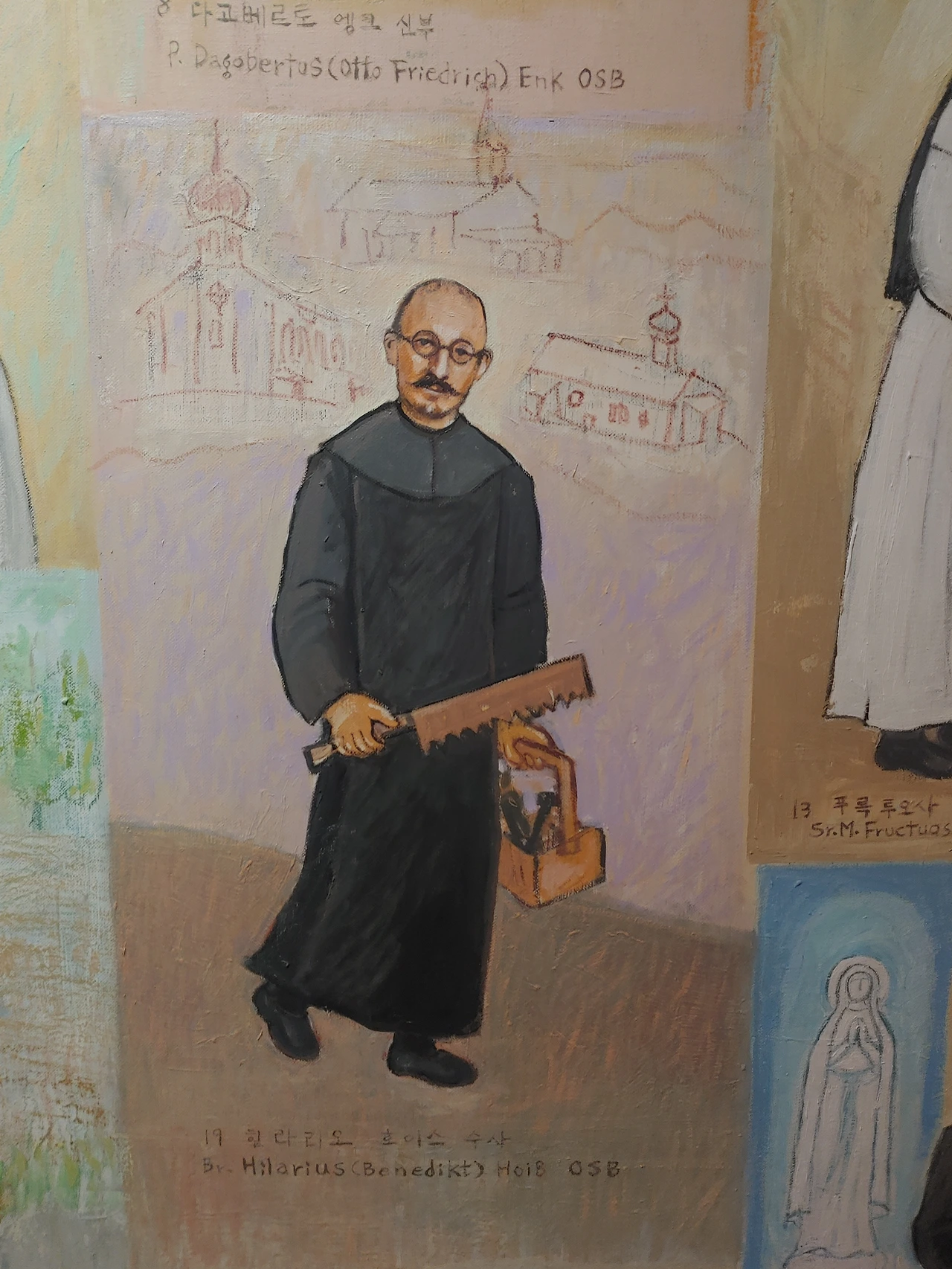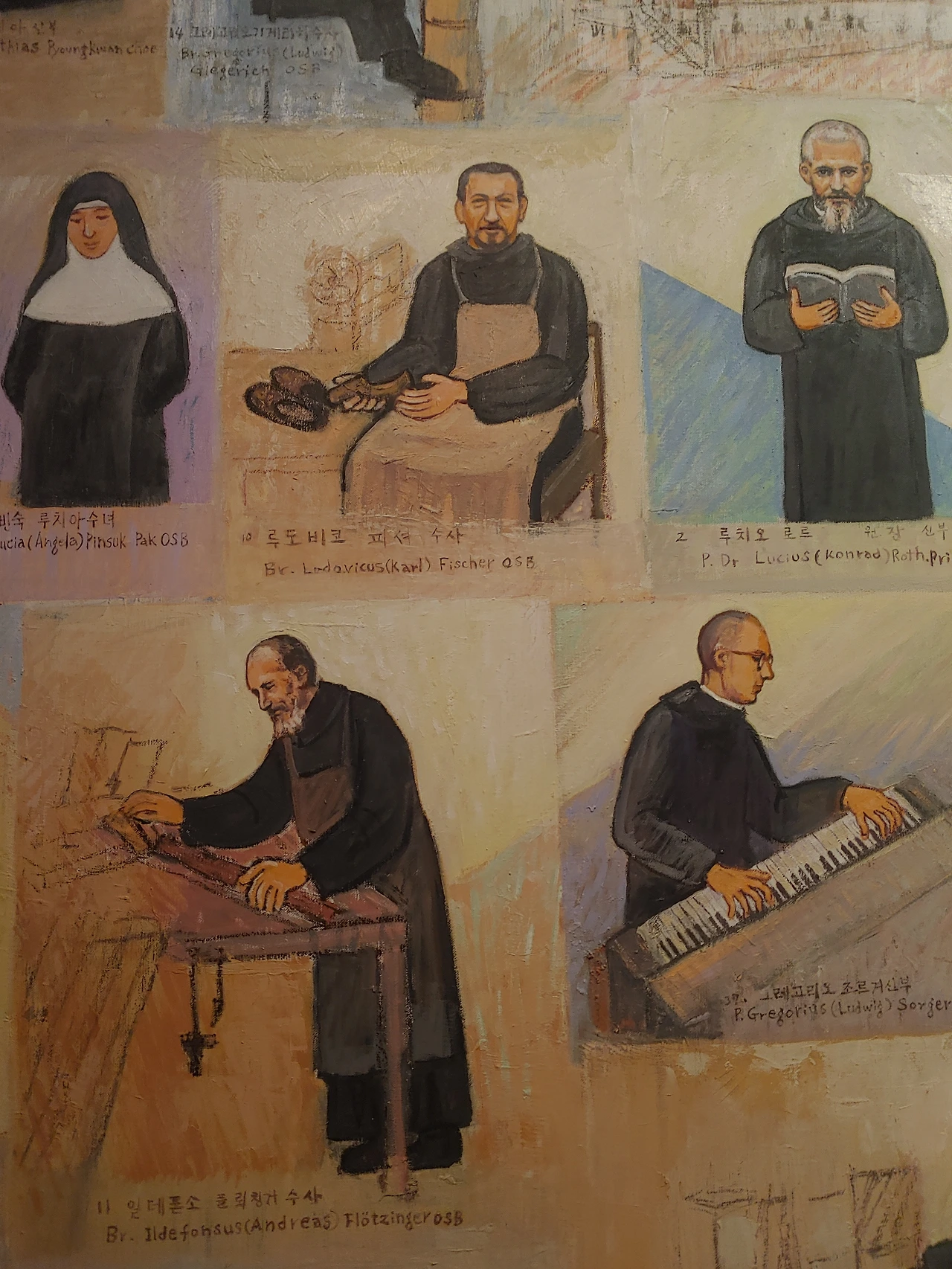 대성당 입구에는 노란색 배경이 눈길을 끄는 대형 유화가 걸려있는데, 수도원이 북한의 덕원에 있던 시절 공산주의자들에 의해 순교한 38분의 수도사들과 수녀님들의 특색이 생생하게 묘사되어 있었다. 나는 그림 앞에 서서 한 분 한 분을 자세히 살펴보았다. 톱과 연장을 들고 있는 분, 밀반죽으로 성체를 만들거나 오르간을 연주하는 분도 보였다. 물자가 넉넉하지 않고 박해를 받던 어려운 시기에도 수도자들은 기도와 매일 각자 자기가 맡은 일을 멈추지 않았다.